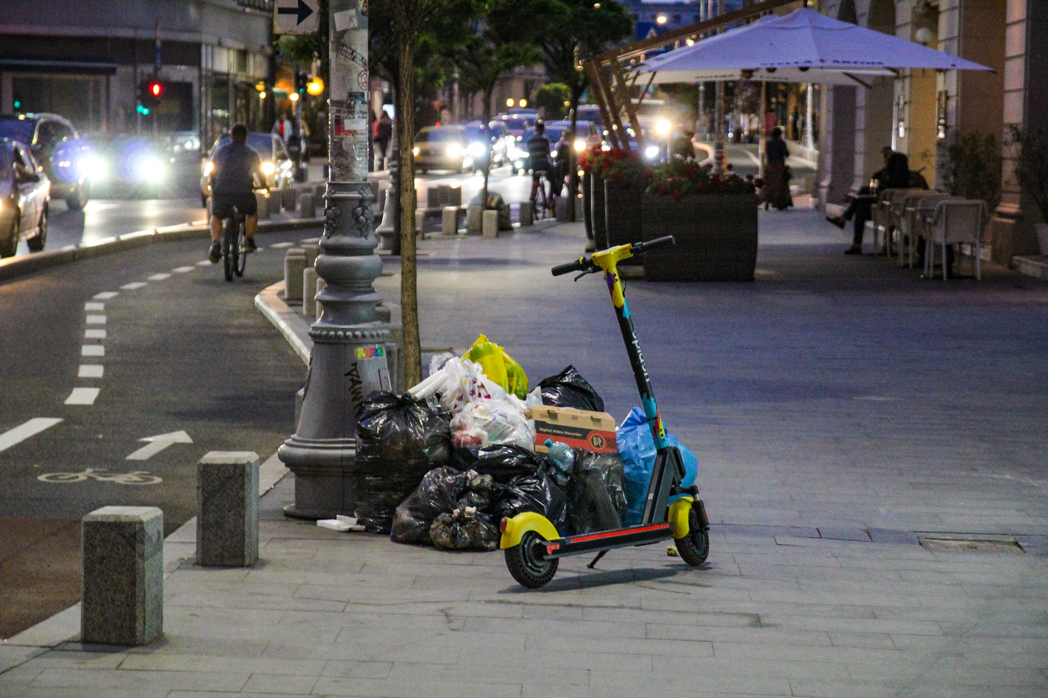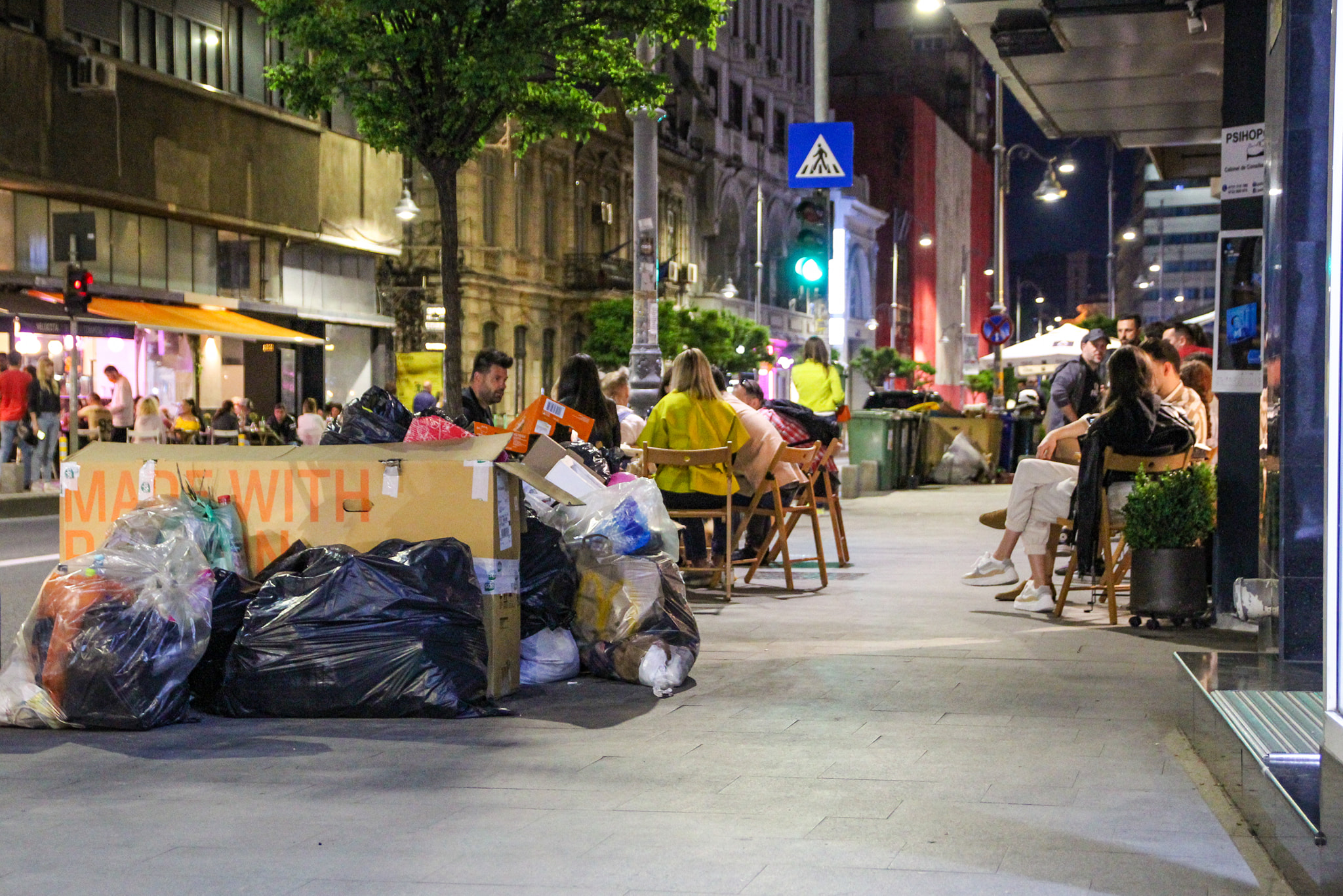 Imaginile surprinse pe Calea Victoriei au devenit virale, în fotografii putând fi văzuţi oameni care stau la mese pe terasele din centru lângă mormane de gunoaie.