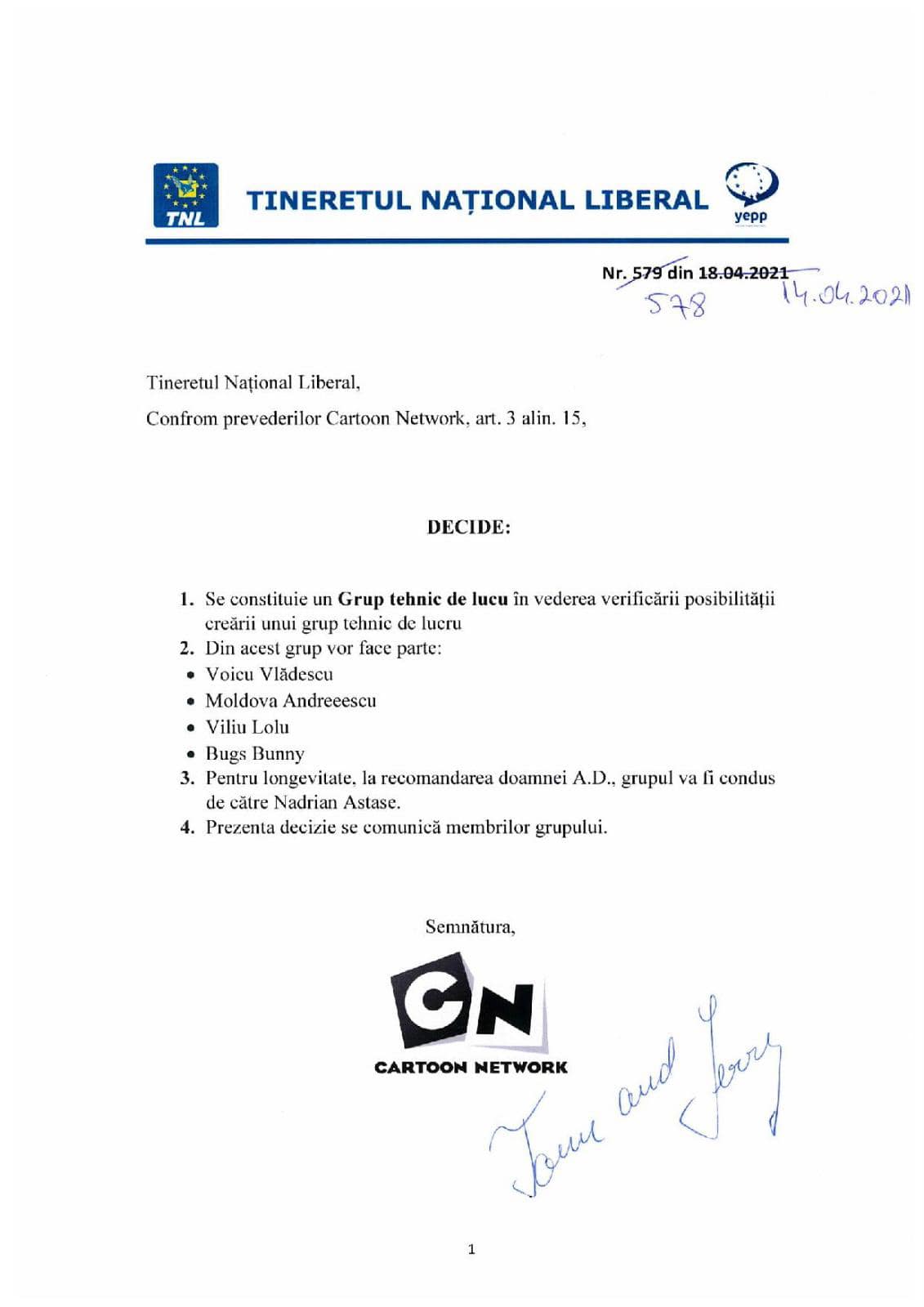 În imaginea photoshopată se dorește constituirea unui ”grup de lucru în vederea verificării posibilității creării unui grup de lucru”, din care vor face parte ”Voicu Vlădescu, Bugs Bunny și Nadrian Astase”. Documentul este semnat de Tom și Jerry, care reprezintă Cartoon Network
