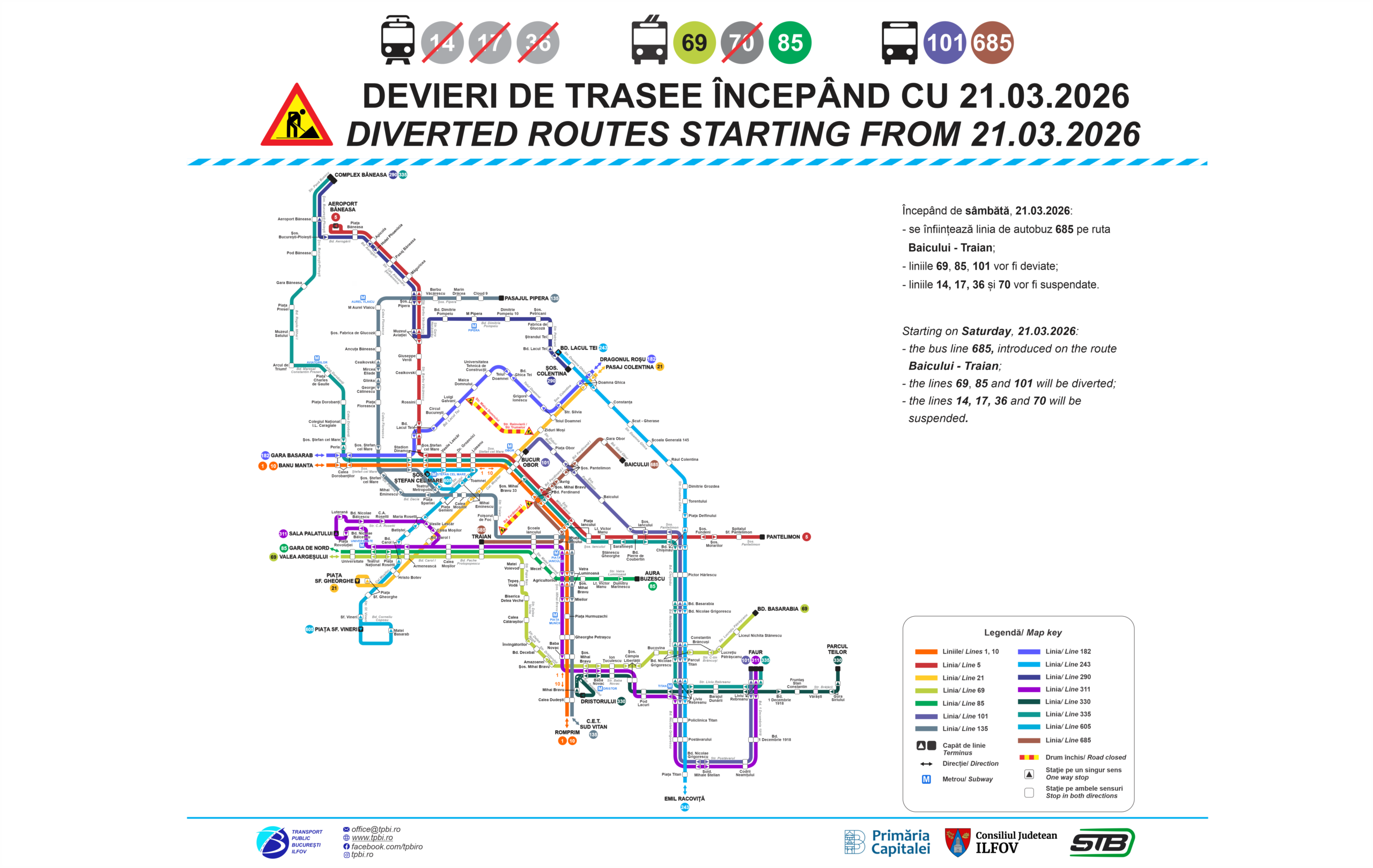 Reprezentanții TPBI recomandă utilizarea transportului subteran pentru evitarea întârzierilor, precum și consultarea aplicației InfoTB sau a platformei online pentru planificarea traseelor. Harta traseelor, aici: https://tpbi.ro/harta-devierilor-generate-de-lucrarile-publice-la-infrastructura-21-03-2026/