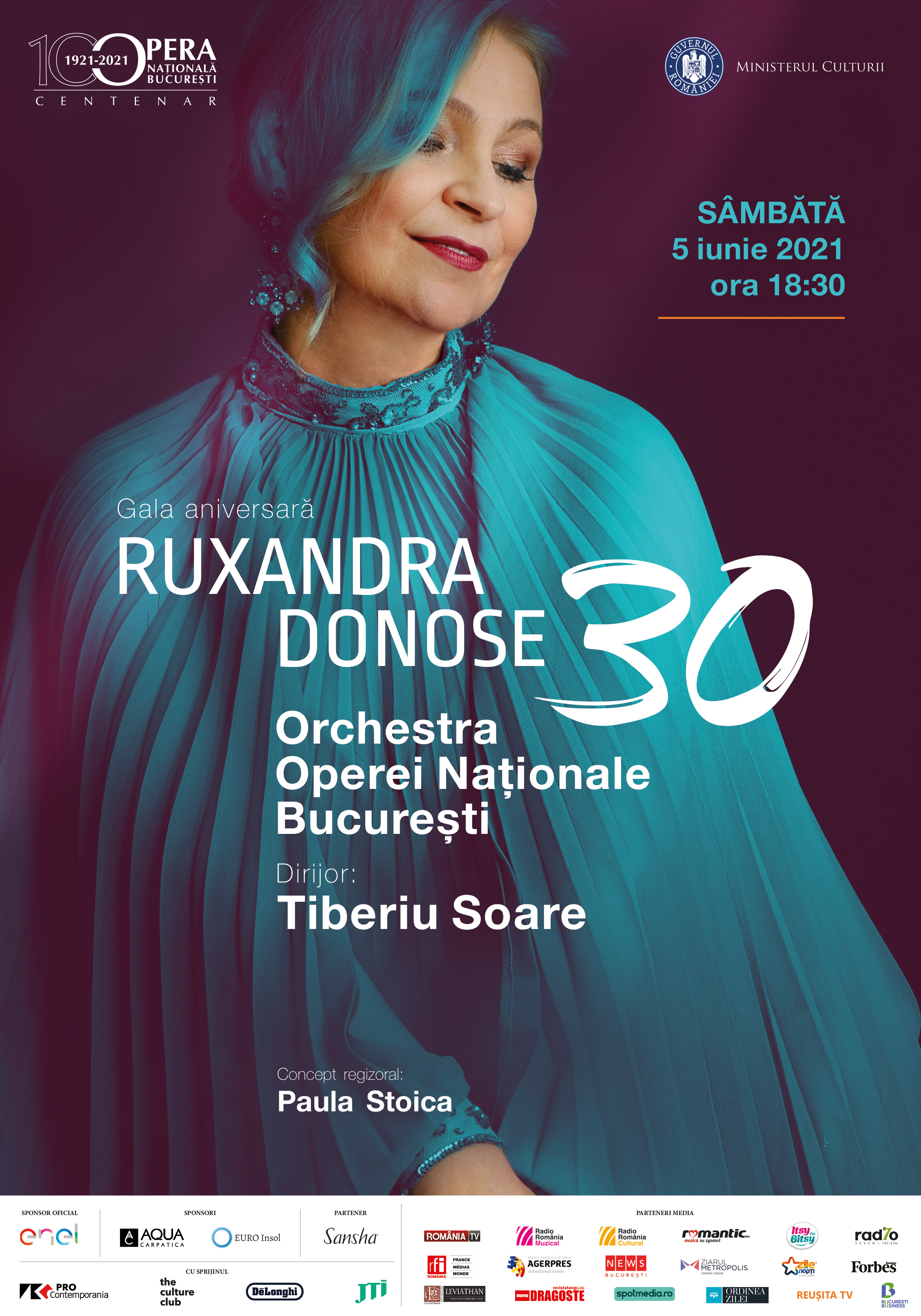 Opera Națională București prezintă sâmbătă, 5 iunie, începând cu ora 18:30, Gala Aniversară „Ruxandra Donose 30”, un eveniment unic menit să celebreze cei 30 de ani de activitate artistică ai celebrei mezzosoprane. La pupitrul dirijoral se va afla maestrul Tiberiu Soare. Conceptul regizoral poartă semnătura Paulei Stoica. Cu participarea Orchestrei Operei Naționale București.