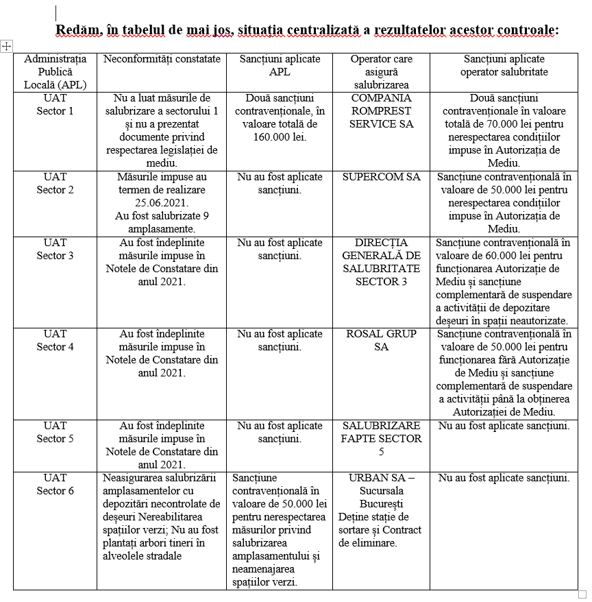 Ca urmare a celor constatate, patru operatori de salubritate au fost sancţionaţi contravenţional pentru lipsa autorizaţiilor de mediu sau pentru nerespectarea prevederilor acestora, iar operatorul din sectorul 3 a primit sancţiune complementară de suspendare a activităţii de depozitare deşeuri de orice fel în spaţii neautorizate.