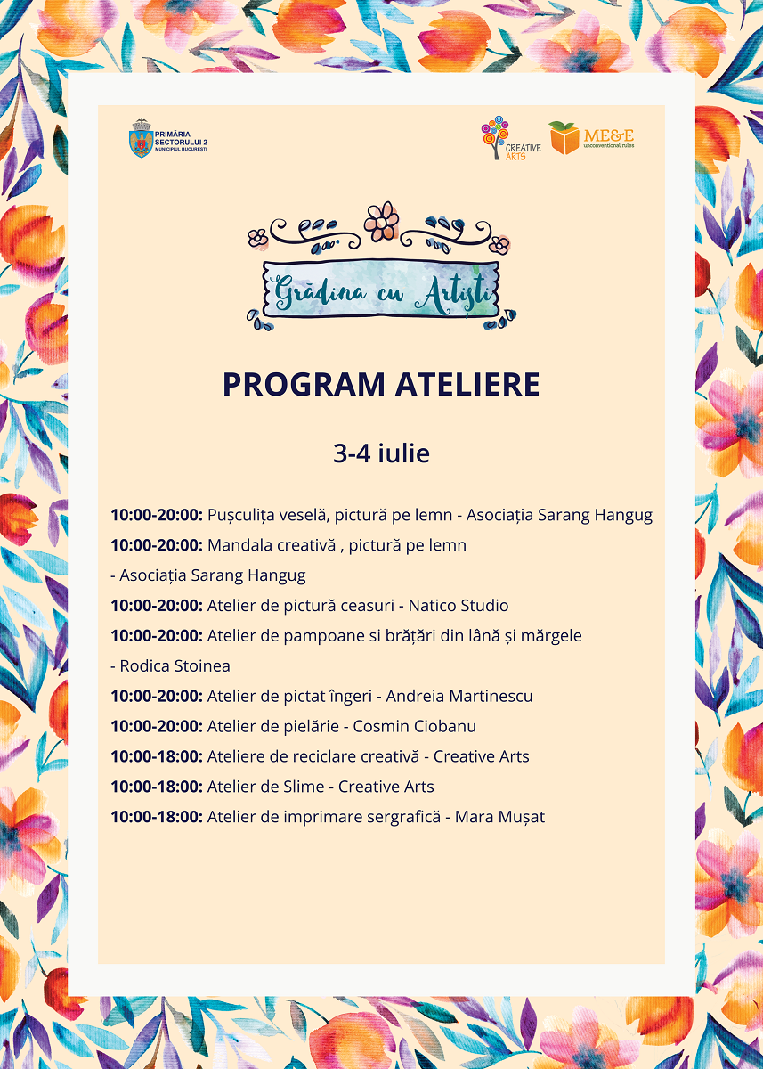 Vor fi organizate ateliere de pictură pe lemn, brăţări din lână şi mărgele, imprimare serigrafică, pielărie, codiţe colorate, animaţie stop motion şi reciclare creativă.