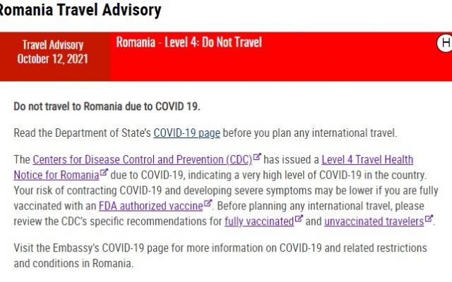 ”Centrul pentru Prevenirea și Controlul Bolilor a emis o avertizare Nivel 4 de Călătorie pentru România din cauza Covid-19, indicând un nivel extrem de ridicat de Covid în această țară. Riscul dvs. de a contracta Covid și a de dezvolta simptome severe este mai scăzut dacă sunteți vaccinat cu schema completă”, se arată în avertizarea Departamentului de Stat al SUA.