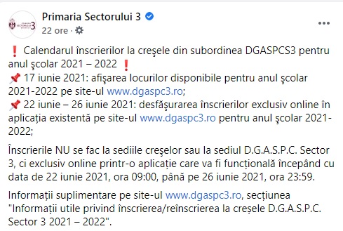 Înscrierile la creșele din Sectorul 3 vor începe în luna iunie, anunță Direcția Generală de Asistență Socială și pentru Protecția Copilului Sectorul 3.