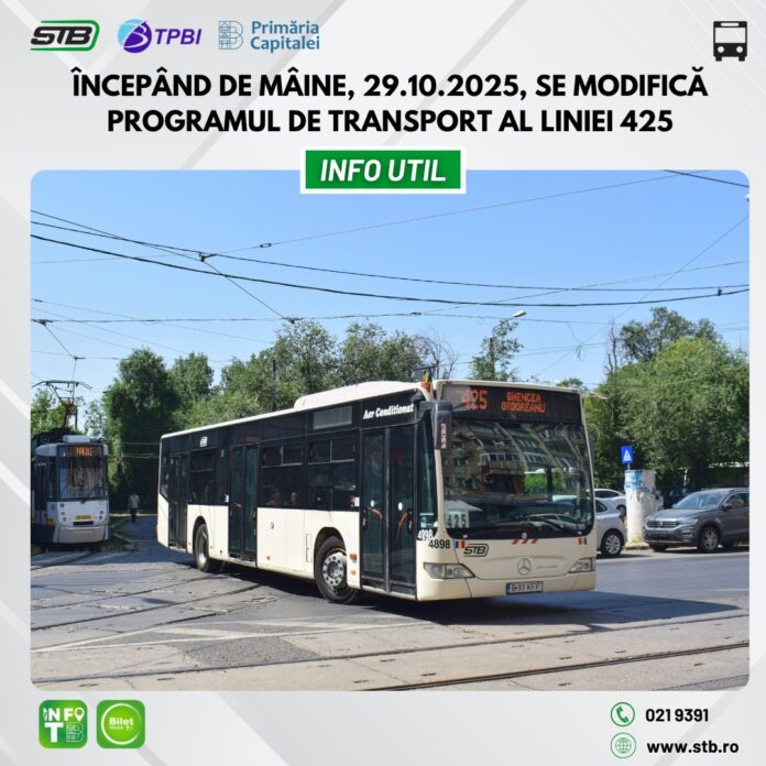 Având în vedere executarea lucrărilor edilitare efectuate în zona capătului de linie „ORDOREANU”, începând cu data de 29.10.2025 și până la finalizarea lucrărilor, programul de transport al liniei 425 se modifică.