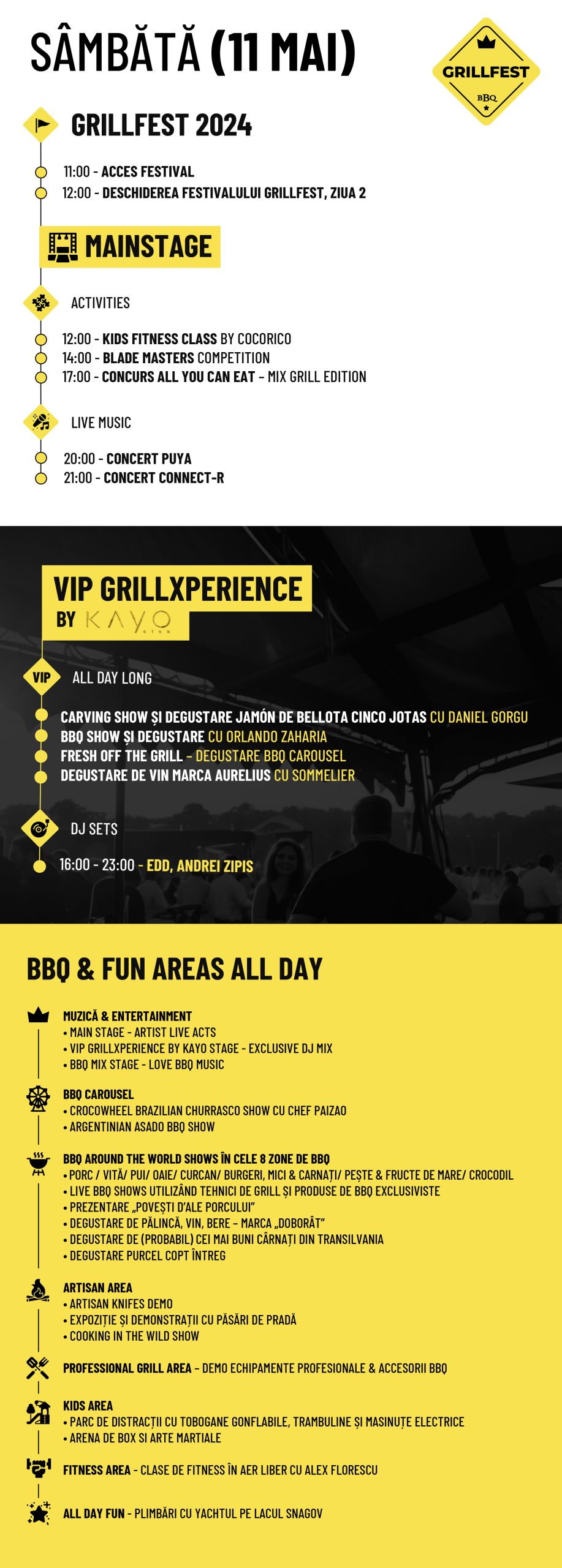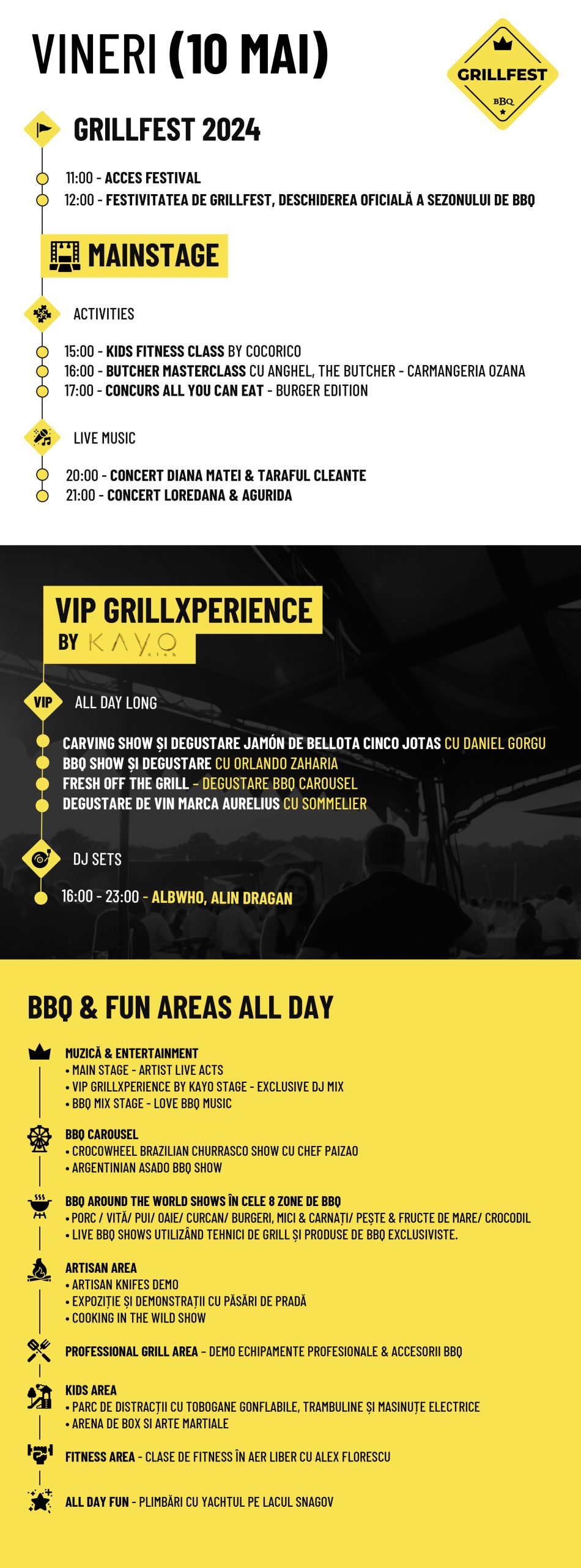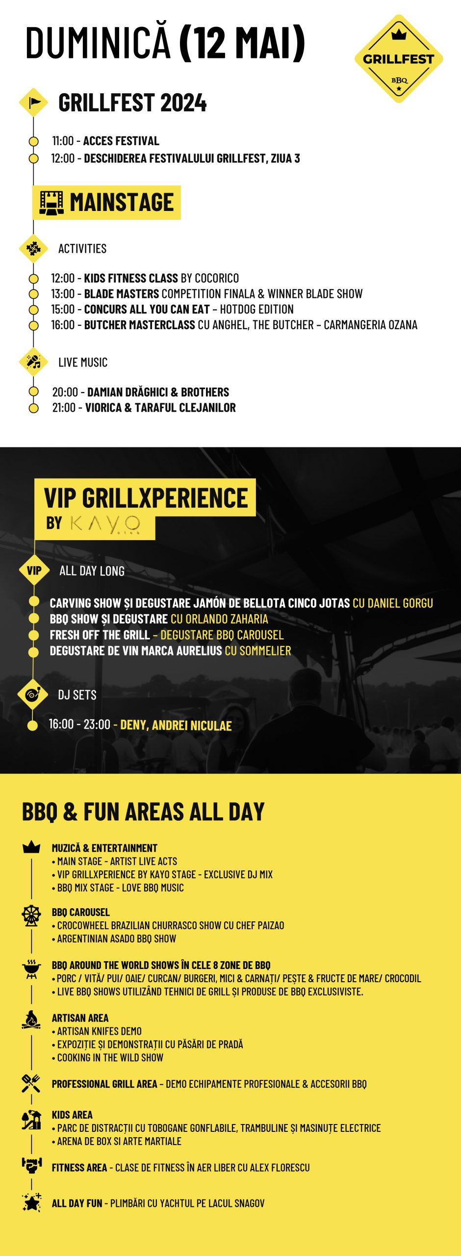 Nu în ultimul rând, VIP GRILLXPERIENCE by KAYO invitații vor avea parte în fiecare zi de carving show și degustare Jamón de Bellota Cinco Jotas cu Daniel Gorgu, BBQ Show și degustare cu Orlando Zaharia, Fresh off the grill – degustare BBQ Carousel și degustare de vin marca Aurelius cu sommelier, totul în atmosfera întreținută de către DJ Albwho și DJ Alin Drăgan (vineri), DJ Edd și DJ Andrei Zipis (sâmbătă), DJ Deny și DJ Andrei Niculae (duminică).