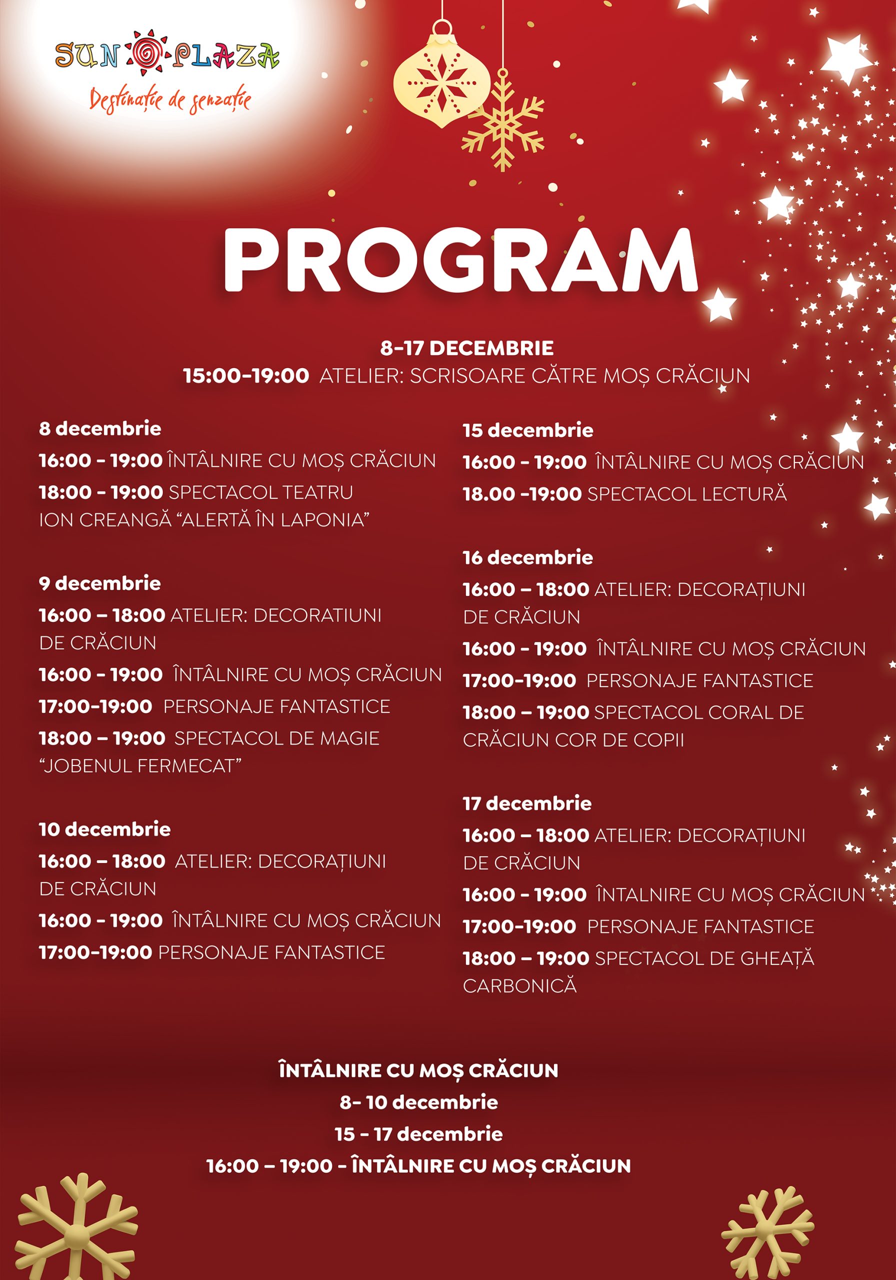 Sun Plaza îi așteaptă pe cei mici, dar și pe cei mari într-o atmosferă de poveste, creată în spiritul celei mai așteptate sărbători din an. Și, la fel ca în fiecare an, intrarea va fi gratuită, pentru că bucuria vizitatorilor a fost, este și va rămâne neprețuită!