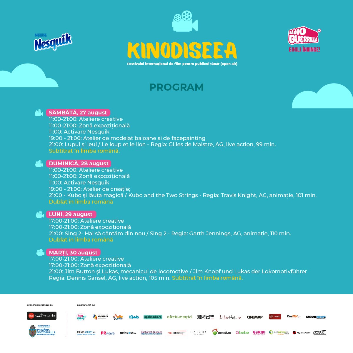 Festivalul va aduce pe marele ecran douăsprezece filme pentru copii, pelicule și animații educative perfecte pentru o seară petrecută împreună cu întreaga familie.