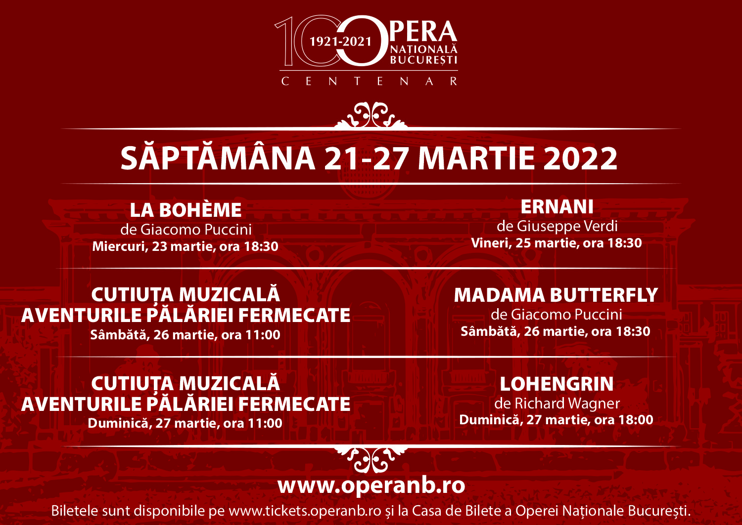 „La Bohème” de Giacomo Puccini, „Ernani” de Giuseppe Verdi, „Madama Butterfly” de Giacomo Puccini și „Lohengrin” de Richard Wagner sunt spectacolele pe care le puteți urmări în această săptămână în Sala Mare de la ONB, toate făcând parte din repertoriul actual al operei bucureștene. Iar în weekend, la matineu, va fi prezentat spectacolul pentru copii „Cutiuța Muzicală – Aventurile Pălăriei Fermecate”, eveniment ce poartă semnătura Teatrului Muzical Ambasadorii.