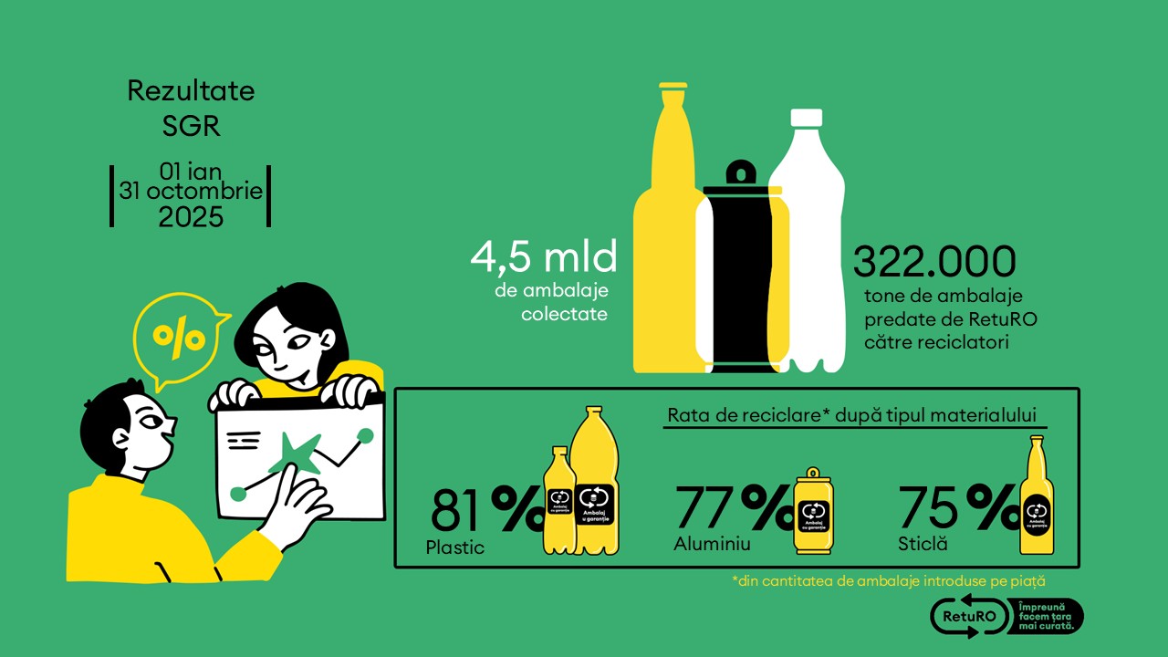 Potrivit sursei citate, cu o rată de colectare de 84% în primele zece luni ale acestui an, Sistemul de Garanţie-Returnare continuă să sprijine tranziţia României către o economie circulară, mobilizând milioane de români să adopte un comportament responsabil faţă de mediu.