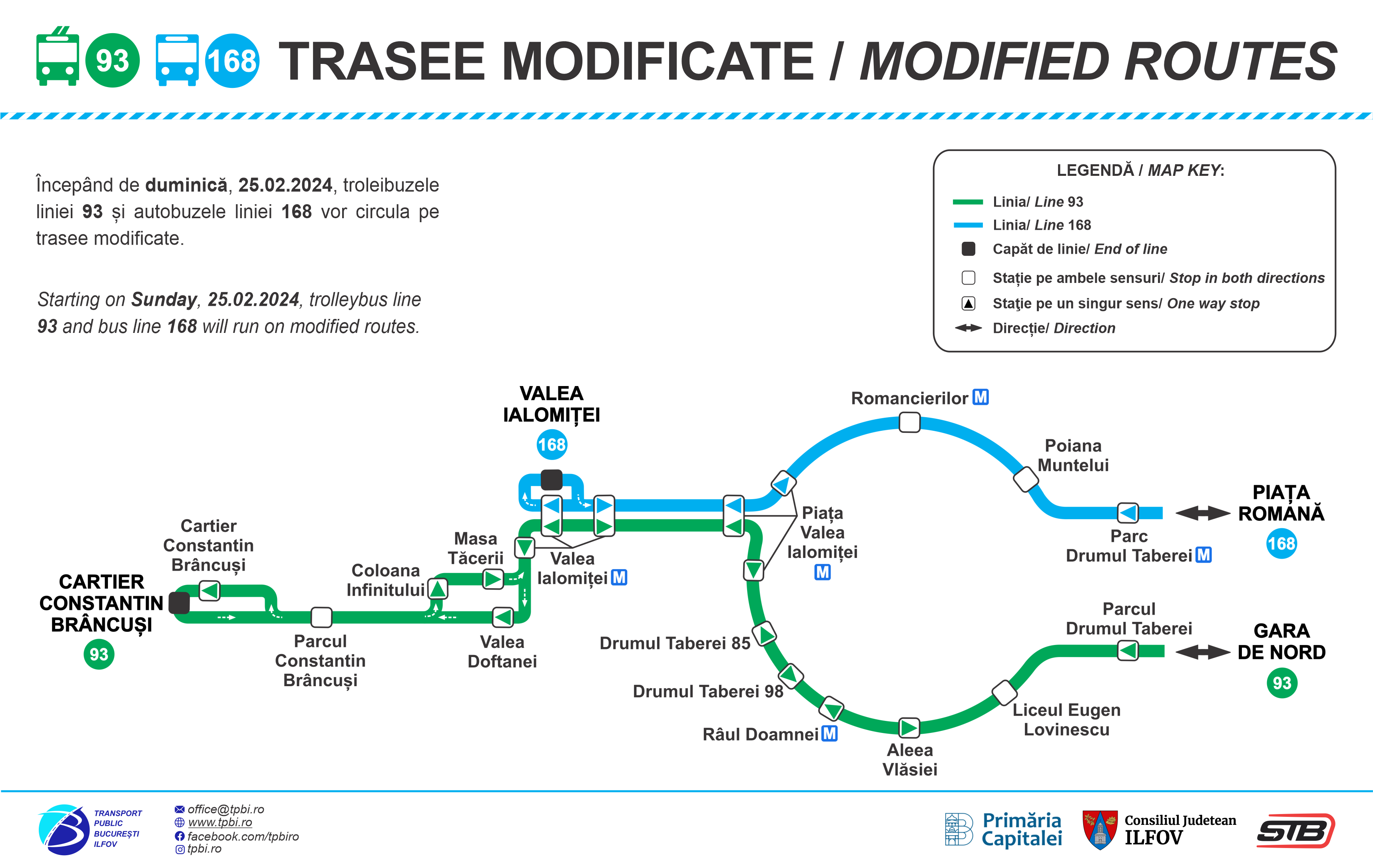 • Asociaţia de Dezvoltare Intercomunitară pentru Transport Public Bucureşti – Ilfov (TPBI) a dispus ca, începând de duminică, 25.02.2024, linia 93 să fie prelungită până în cartierul Constantin Brâncuşi şi să fie operată numai cu troleibuze noi Solaris Trollino 12M cu autonomie, iar linia de autobuz 168, care asigura până acum transportul călătorilor din acest cartier, va întoarce la terminalul „Valea Ialomiţei”.