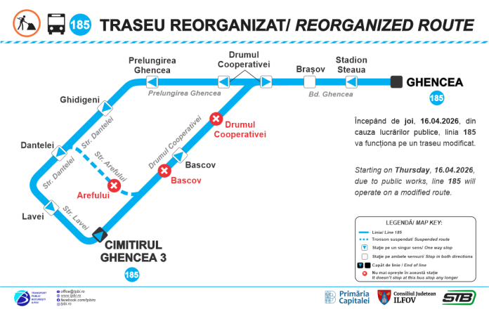 Potrivit Asociaţiei de Dezvoltare Intercomunitară pentru Transport Public Bucureşti – Ilfov (TPBI), pe perioada lucrărilor, autobuzele liniei 185 vor circula astfel: terminal „Ghencea”, Bd. Ghencea, Prelungirea Ghencea, Str. Ghidigeni, Str. Dantelei, Str. Lavei, Drumul Cooperativei, „Cimitirul Ghencea 3”. Sensul spre „Ghencea” nu va fi modificat.