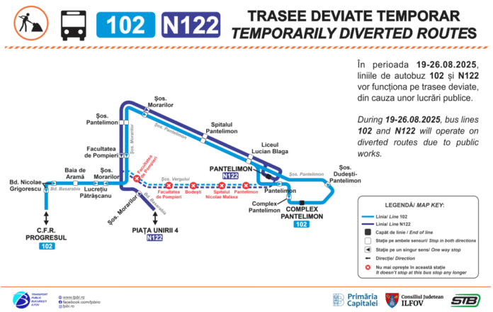 Traseele liniilor 102 și N122 vor fi modificate în perioada 19.08.2025-26.08.2025, pentru a permite executarea unor lucrări la rețeaua de distribuție gaze de pe Șoseaua Vergului, în zona intersecției cu Șoseaua Morarilor.