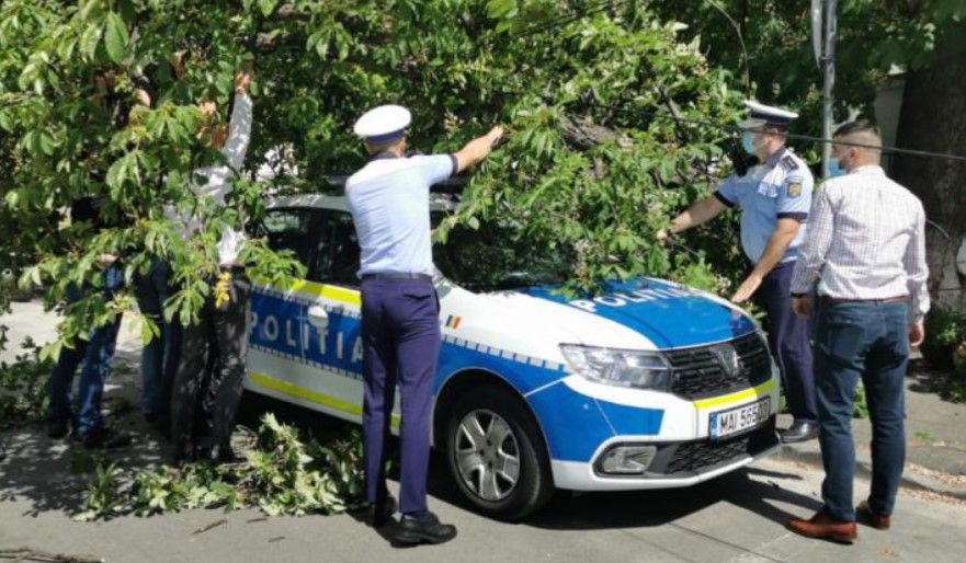 Maşina de Poliţie, parcată pe o stradă din Bucureşti chiar lângă un copac, a fost strivită de arborele pus la pâmânt de rafalele de vânt puternice.