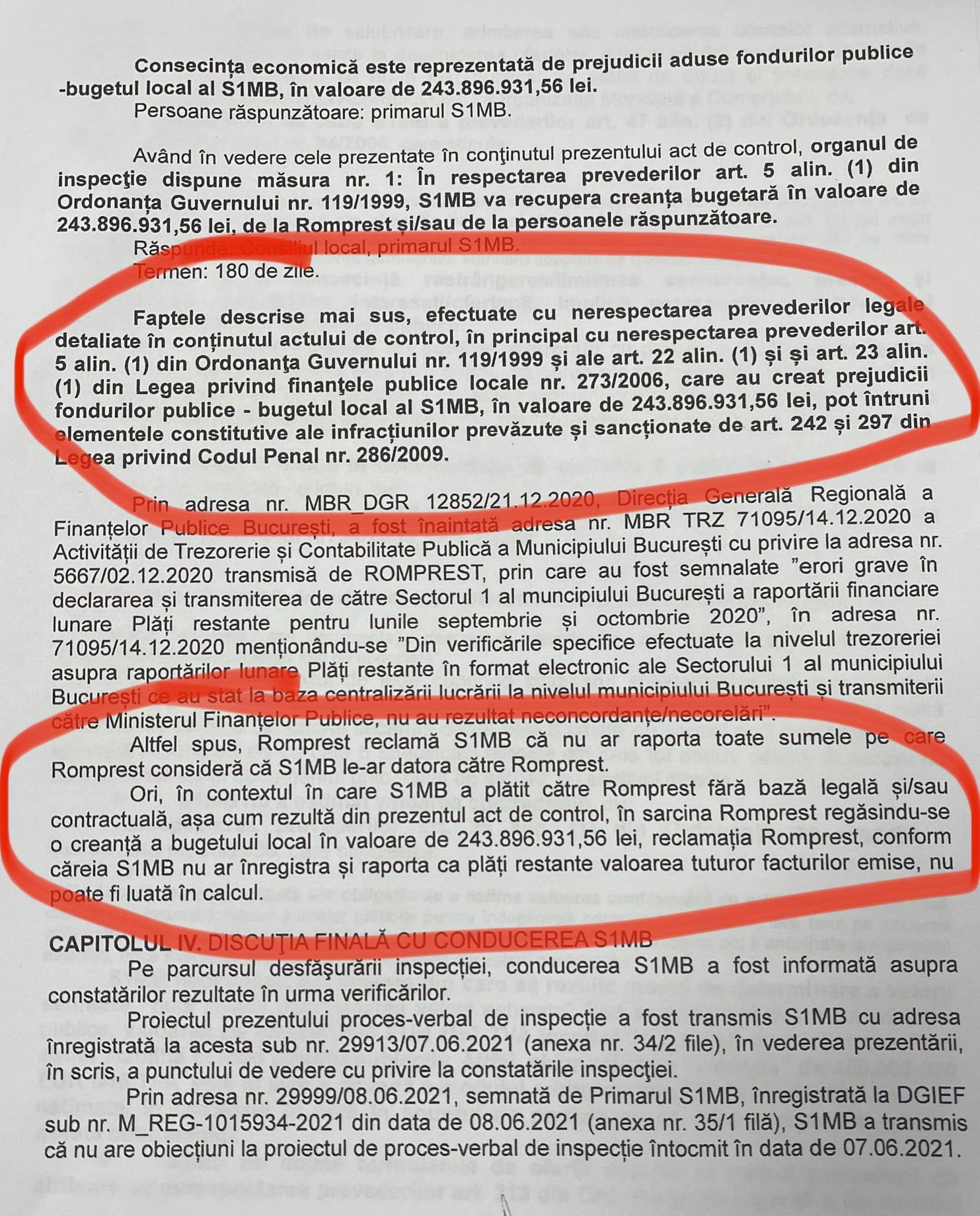 - Echipa de control a dispus ca Primăria Sectorului 1 să recupereze creanța bugetară de 243.896.931,56 lei, de la Compania Romprest Service SA și/sau de la persoanele răspunzătoare.