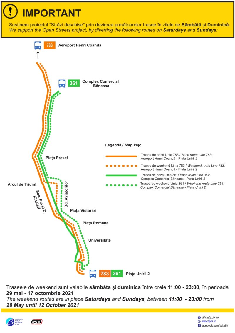 Pentru a sprijini proiectul Primăriei Municipiului Bucureşti „Străzi Deschise”, Asociaţia de Dezvoltare Intercomunitară pentru Transport Public Bucureşti-Ilfov a dispus ca în toate zilele de weekend din perioada 29 mai – 17 octombrie, între orele 11,00 – 22,00, autobuzele liniilor 361 şi 783 să circule pe trasee modificate.