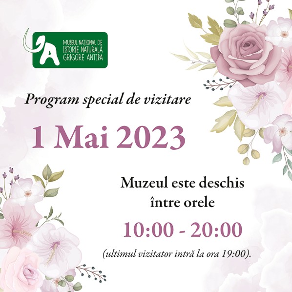 Muzeul Naţional de Istorie Naturală „Grigore Antipa” va fi deschis în ziua de 1 mai, în intervalul orar 10,00 – 20,00, cu ultima intrare la ora 19,00.