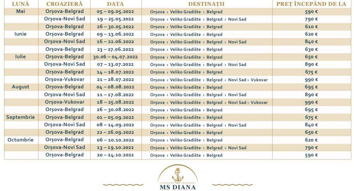 Din 5 mai, nava MS Diana va oferi croaziere internaționale pe Dunăre pentru turiștii români. Prima croazieră este programată în perioada 5-9 mai 2022, pe ruta Orșova – Veliko Gradište – Belgrad, cu tarife ce pornesc de la 590 EURO.