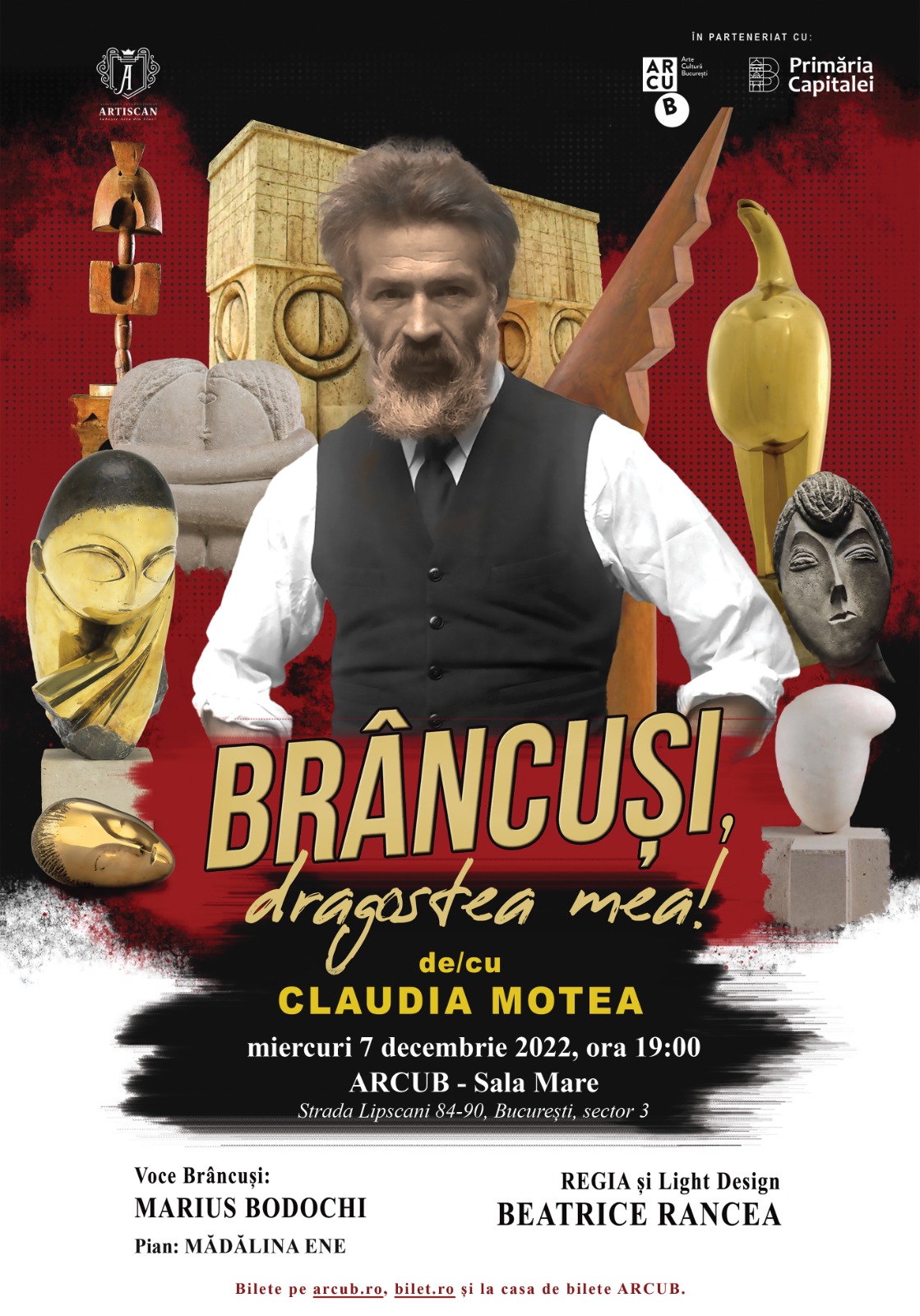 Spectacolul one-woman-show ‘Brâncuşi, dragostea mea’, regizat de Beatrice Rancea, creat şi interpretat de Claudia Motea, va fi prezentat pe 7 decembrie, la Sala Mare a ARCUB, informează un comunicat de presă.