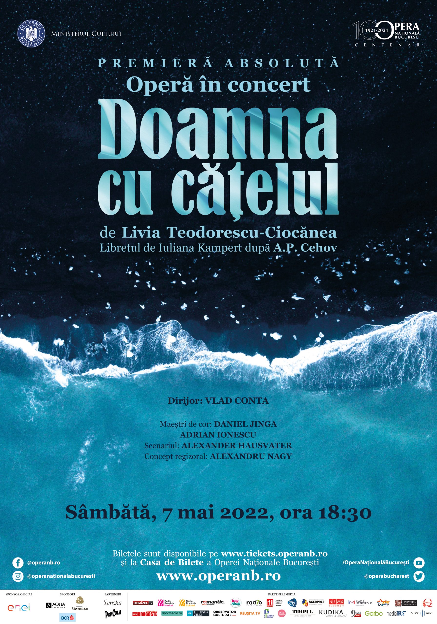 Premiera absolută a operei „Doamna cu Căţelul” de Livia Teodorescu-Ciocănea, după Cehov, în varianta de concert, va avea loc pe 7 mai, de la ora 18,30, la Opera Naţională Bucureşti.
