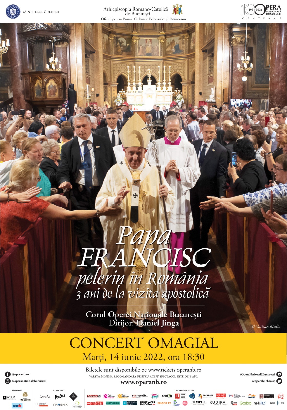 Opera Națională București anunță concertul „PAPA FRANCISC – Pelerin în România, 3 ani de la vizita Apostolică”, eveniment ce va avea loc marți, 14 iunie, ora 19:00, în sala mare de spectacole.