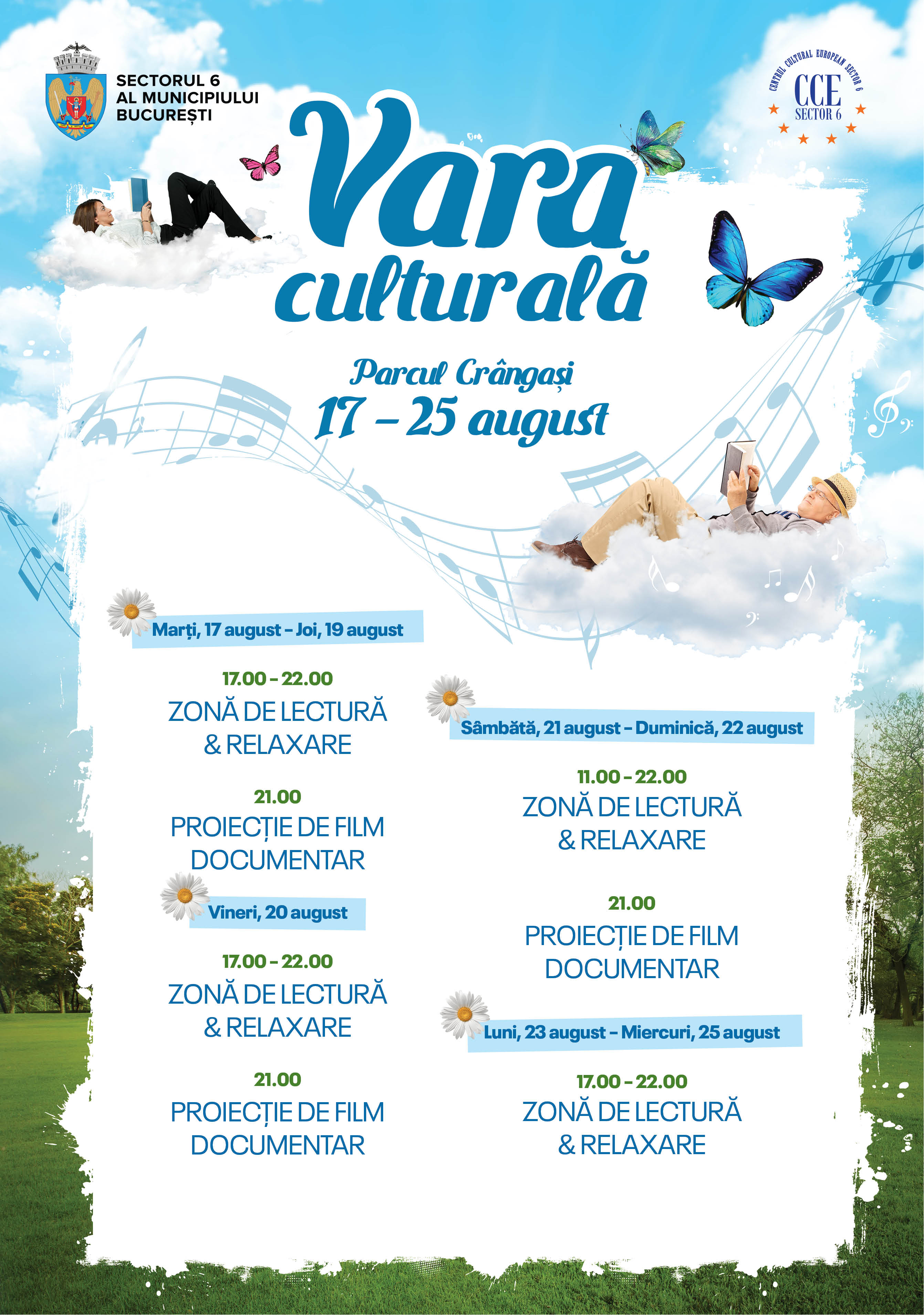Între 17 şi 25 august, în Parcul Crângaşi, bucureștenii sunt așteptați cu proiecţii de filme documentare, lectură şi relaxare la Vara Culturală!