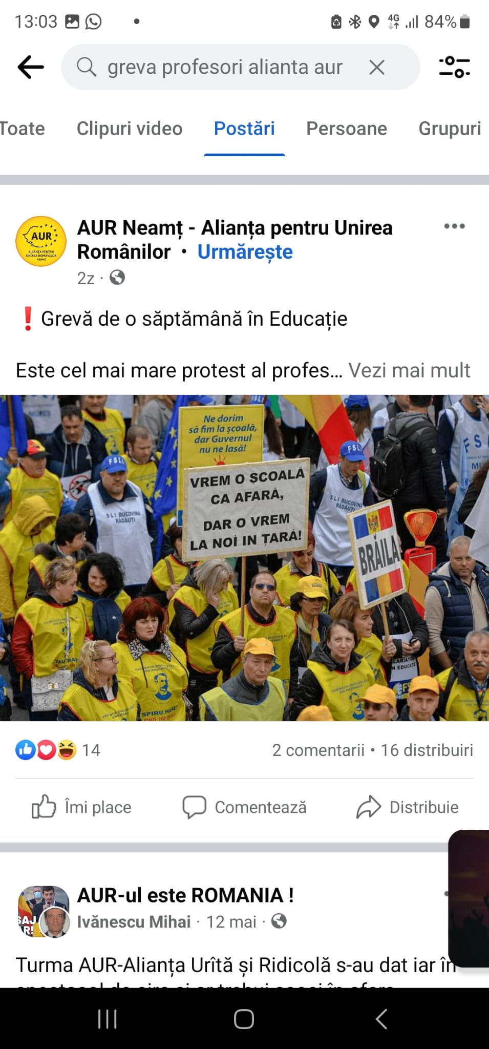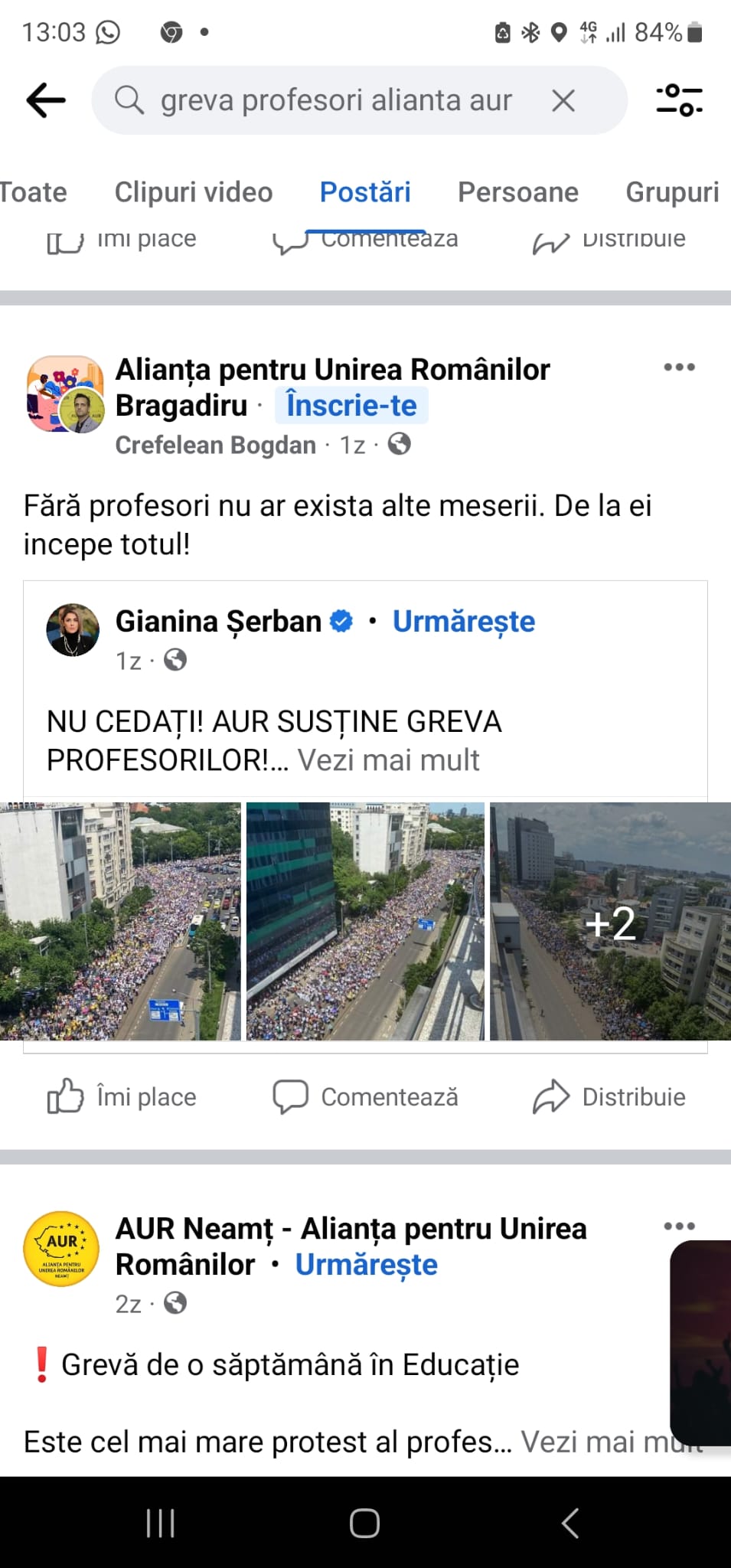 Mai multe postări de pe Facebook are AUR arată că membrii partidului sunt solidari cu profesorii intrați în grevă.
