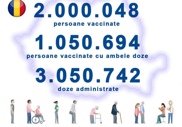 Astfel, erau înregistrate ca fiind vaccinate 2.000.048 de persoane în toată țara, la ora 10.00, dintre care 1.050.694 de persoane au primit deja ambele doze de vaccin.