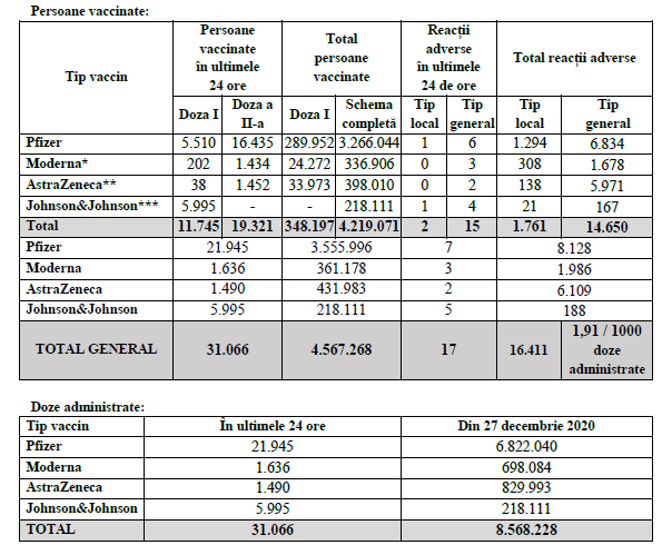 În total, de la începutul campaniei au fost vaccinate 4.567.268 de persoane, din care 3.555.996 cu Pfizer, 361.178 cu Moderna, 431.983  cu AstraZeneca şi 218.111 cu Johnson & Johnson.