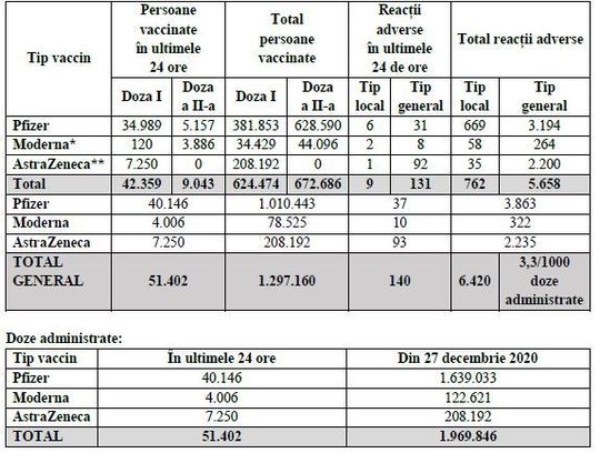 Comitetul Naţional de Coordonare a Activităţilor privind Vaccinarea împotriva COVID-19 (CNCAV) a anunţat, miercuri, că în ultimele 24 de ore au fost vaccinate peste 51.000 de persoane şi s-au raportat 140 de reacţii adverse.