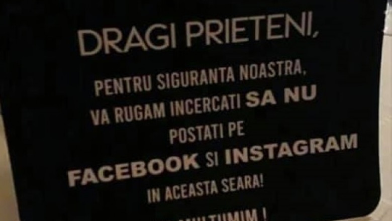 Pe o masă dintr-un restaurant de pe Șoseaua Nordului era postat mesajul: „Dragi prieteni, pentru siguranța noastră, vă rugăm încercați să nu postați pe Facebook în această seară”.