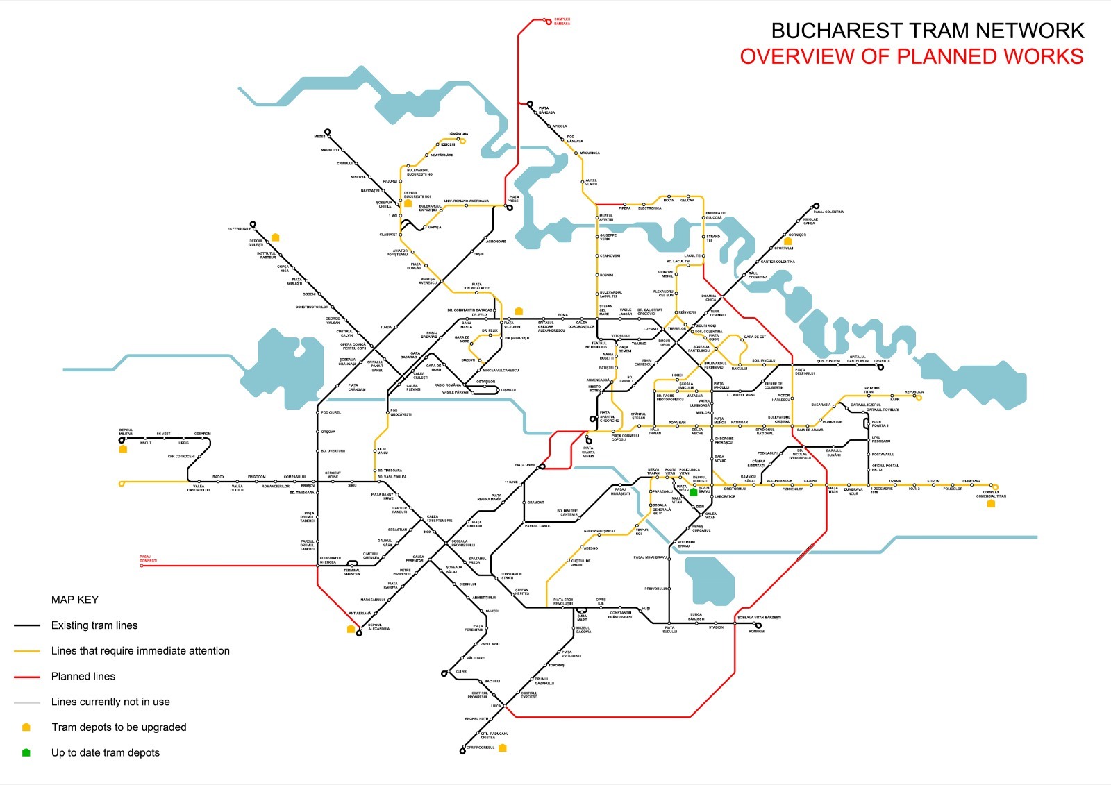 ”Avem în momentul de faţă o reţea de linii de tramvai de 150 de kilometri, din care 100 de kilometri sunt modernizaţi la începutul anilor 2000, îi vedeţi cu negru pe hartă, 50 de kilometri nu au mai fost modernizaţi şi trebuie să facem, îi vedeţi cu galben pe planşă, şi mai sunt încă 30 de kilometri pe care ne propunem să îi avem construiţi, cei pe care îi vedeţi cu culoarea roşie pe planşă.