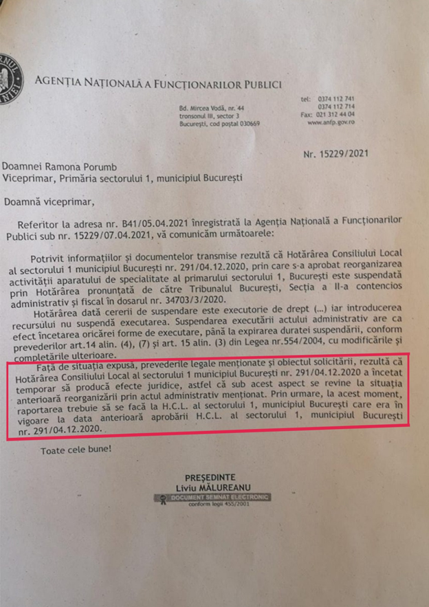 Consilierii PNL Sector 1 mai spun că punctul de vedere al ANFP este, de asemenea, extrem de clar şi solicită „să se revină la situaţia anterioară reorganizării prin actul administrativ menţionat”, adică HCL suspendată de instanţă.