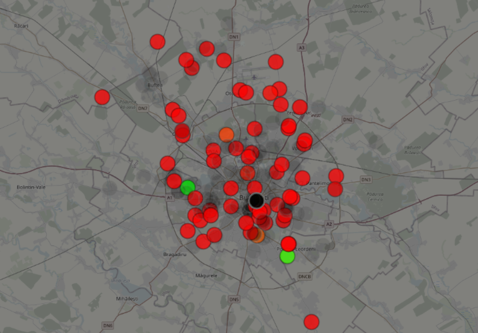 Aproape toți senzorii Urad Monitor indică, miercuri dimineață, o poluare masivă în Capitală, harta senzorilor fiind roșie.