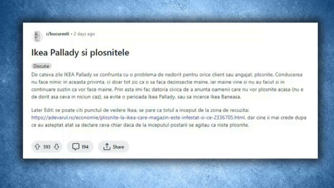 Problema a fost semnalată pe o rețea de socializare, după care conducerea Ikea Pallady a confirmat posibila apariție a insectelor în unele zone din depozit. Responsabilii precizează că fac o investigație amplă pentru a rezolva eventualele probleme.