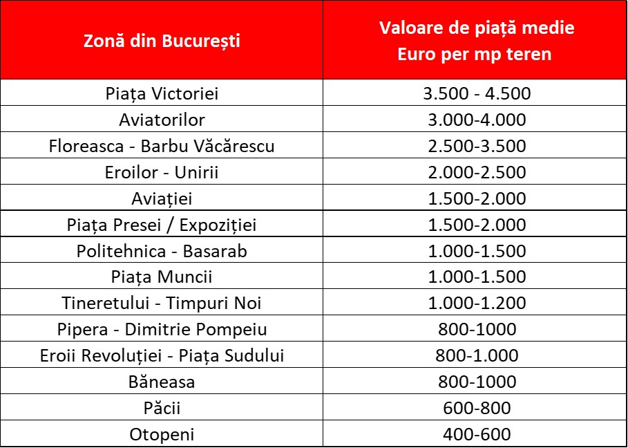Din analiza prețurilor terenurilor, în cele mai cerute zone de dezvoltare pe piața rezidențială, au rezultat valori între 400 și 800 Euro, la periferie (Otopeni, Păcii), și 3.500 – 4.500 Euro pentru mp de teren în centrul Capitalei (Piața Victoriei și Aviatorilor).