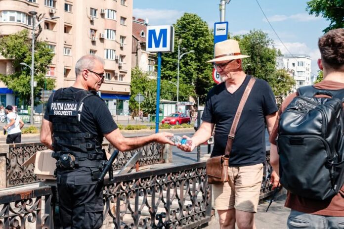 Echipe ale Poliției Locale București și Direcției Generale pentru Situații de Urgență distribuie apă potabilă gratuită în mai multe puncte intens circulate din Capitală – stații de transport public, intersecții aglomerate și zone pietonale.