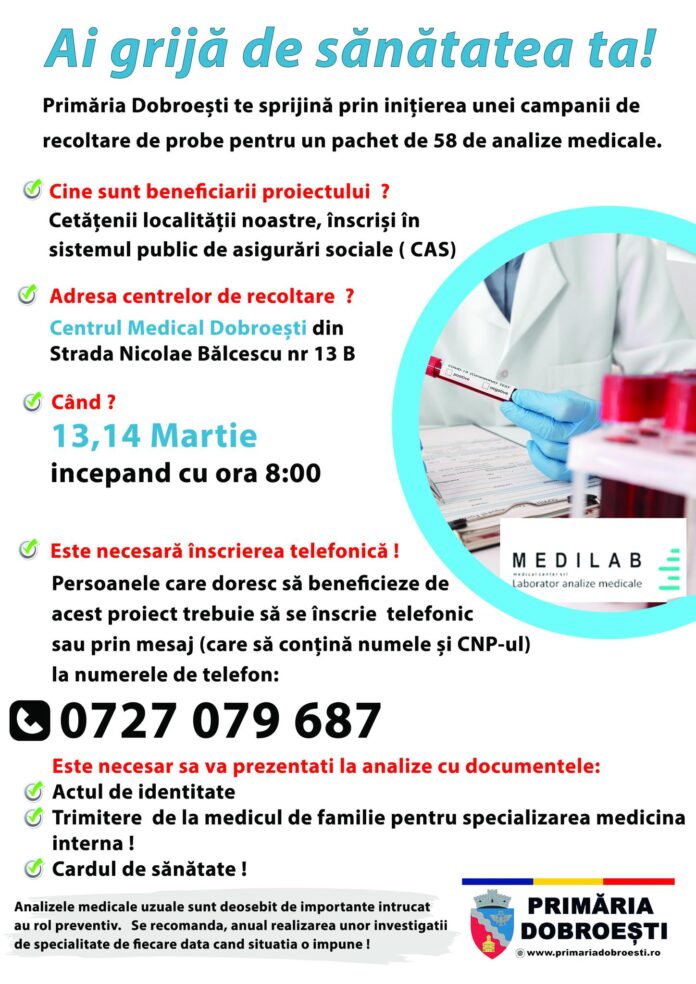 Primăria Dobroești anunță o nouă campanie de recoltare de probe pentru un pachet de 58 de analize medicale.