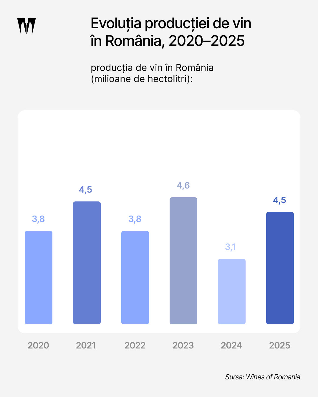 În contextul unei producții globale încă sub nivelul mediei ultimilor ani, evoluția vinului românesc din 2025 indică nu doar o revenire după un an agricol dificil, ci și un potențial real de consolidare pe piețele externe.