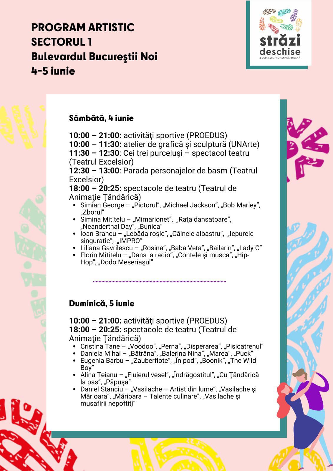 „În acest weekend, Calea Victoriei şi Bulevardul Kiseleff nu devin pietonale. Singura zonă cu evenimente artistice #Străzideschise în weekendul 4-5 iunie este Bulevardul Bucureştii Noi”, anunță organizatorii pe pagina de Facebook „Străzi deschise”.