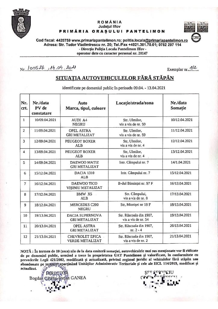 În termen de 10 zile de la data de astăzi, 14.04.2021, proprietarii autovehiculelor mai jos menționate, au obligația să le ridice pe de domeniul public, conform prevederilor legii 421/2002 și HCL 5/27.01.2021.