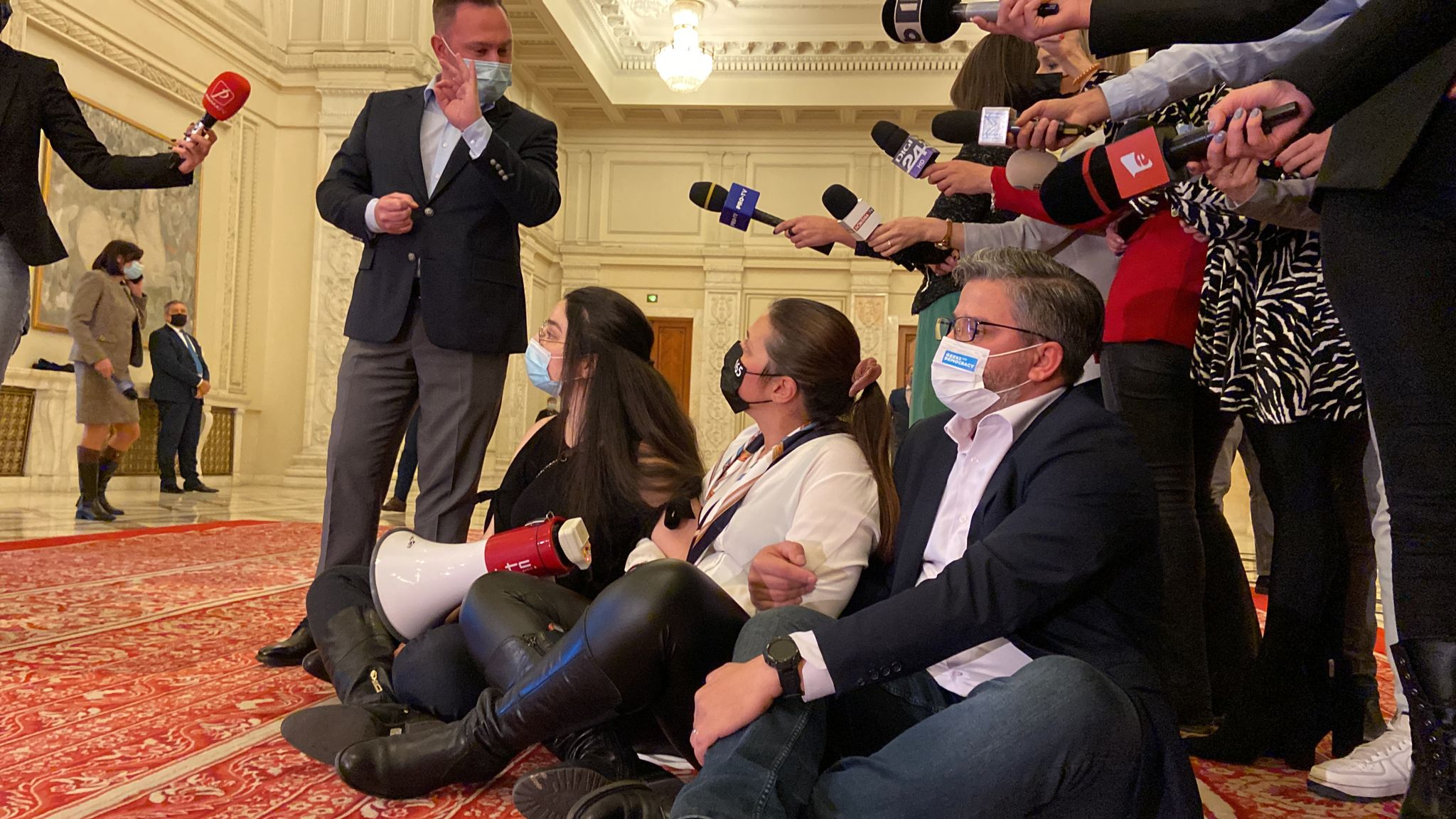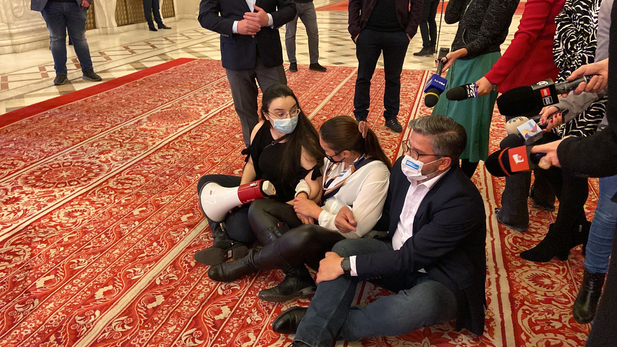 Trei protestatari se țin de braț, așezați pe jos, după ce paza a încercat să îi îndepărteze.