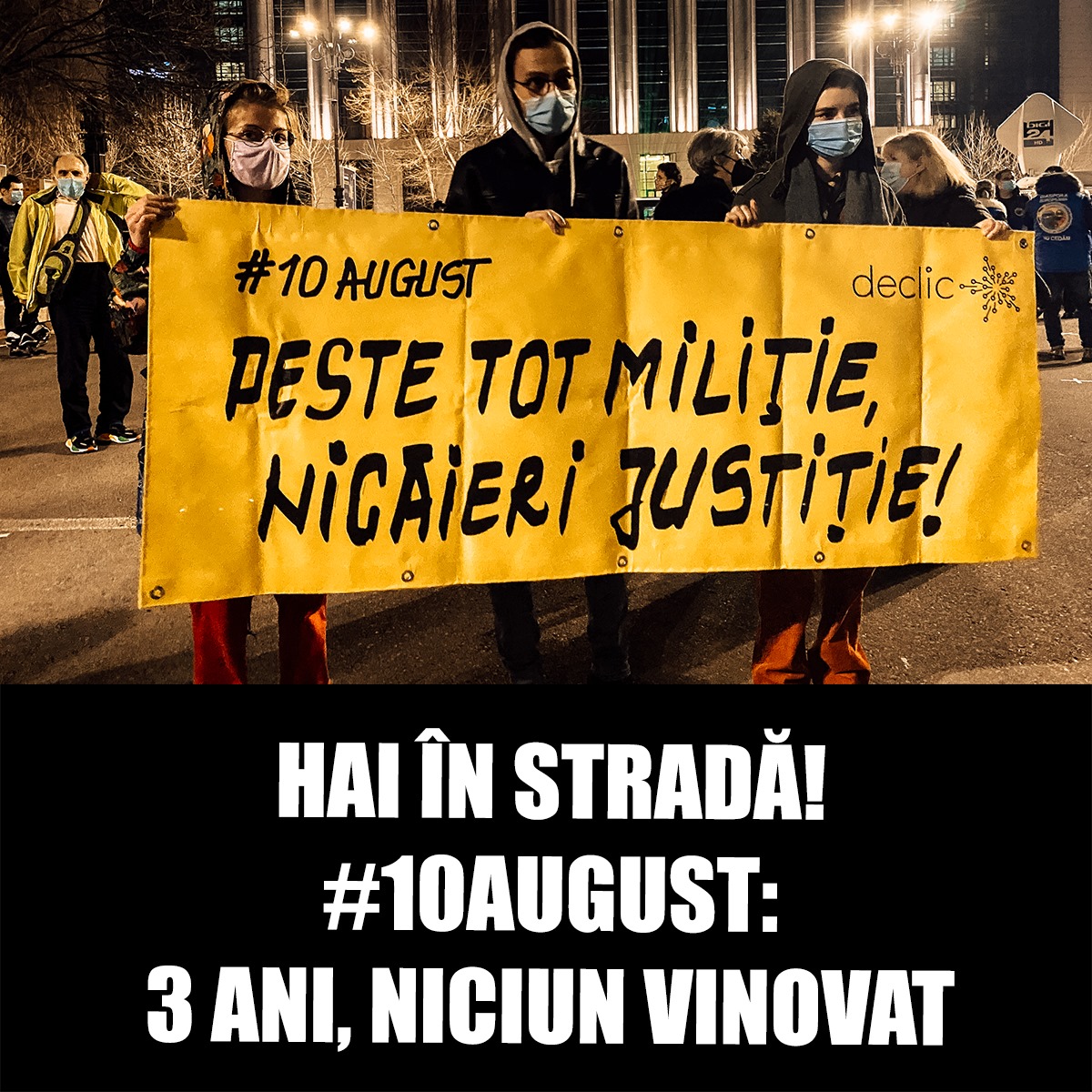 „Au trecut trei ani de când manifestaţia paşnică din 10 august 2018 – Piaţa Victoriei a fost spulberată cu violenţă de către autorităţile statului, cu ajutorul Jandarmeriei Române, încălcând drepturile cetăţenilor care îşi manifestau în stradă nemulţumirea cu privire la modificările legislative din domeniul Justiţiei. Diasporenii veniţi să protesteze în ţară au fost trataţi de către statul român cu gaze, bastoane, calomnii şi manipulările de la televizor”, afirmă organizatorii protestului, între care Declic şi Evoluţie în Instituţie.