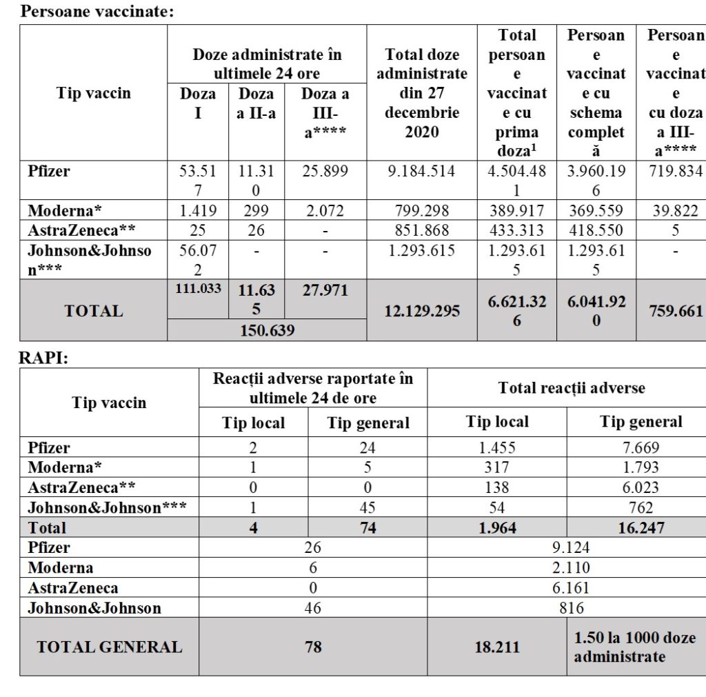 150.639 de persoane s-au vaccinat anti-COVID în ultimele 24 de ore, dintre care 111.033 cu prima doză, ceea ce reprezintă recorduri de la începutul campaniei de vaccinare.