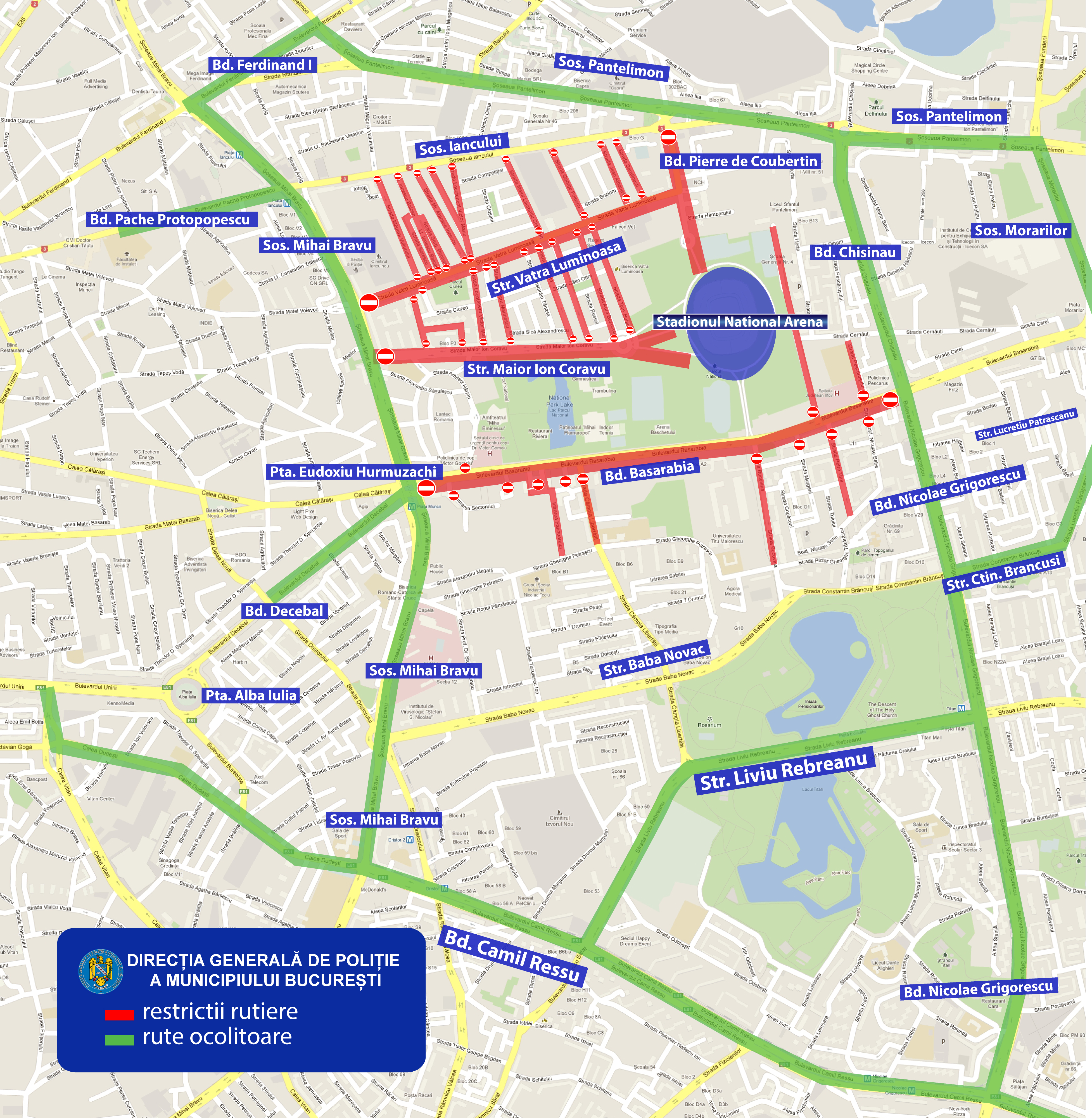„În data de 21 iunie a.c., traficul rutier se va restricţiona gradual, începând cu ora 7.00, în funcţie de afluenţa publicului şi dacă situaţia o va impune, iar începând cu ora 14.00 va fi restricţionat complet, după cum urmează: Str. Maior Coravu, între Şos. Mihai Bravu şi intrarea în stadionul Naţional Arena, precum şi străzile care intersectează şi acced în acest tronson; Bd. Pierre de Coubertin, între Şos. Iancului şi sensul giratoriu de la intrarea în Stadionul Arena Naţională, precum şi străzile care intersectează şi acced în acest tronson; Str. Vatra Luminoasă, între Şos. Mihai Bravu şi Bd. Pierre de Coubertin, precum şi străzile care intersectează şi acced în acest tronson; Str. Tony Bulandra; Bd. Basarabia între Piaţa Muncii şi Bd. Chişinău, precum şi străzile care intersectează şi acced în acest tronson”, potrivit comunicatului Brigăzii Rutiere.
