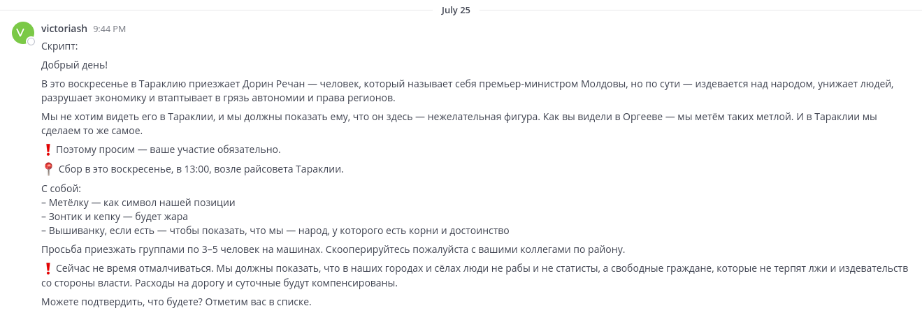 Tot din conversațiile grupului reiese că, în ajunul vizitei prim-ministrului Dorin Recean la Taraclia, pe 27 iulie, au fost planificate acțiuni de protest. Oamenii erau îndemnați să vină cu mături, organizându-se în grupuri de câte 3-5 persoane.