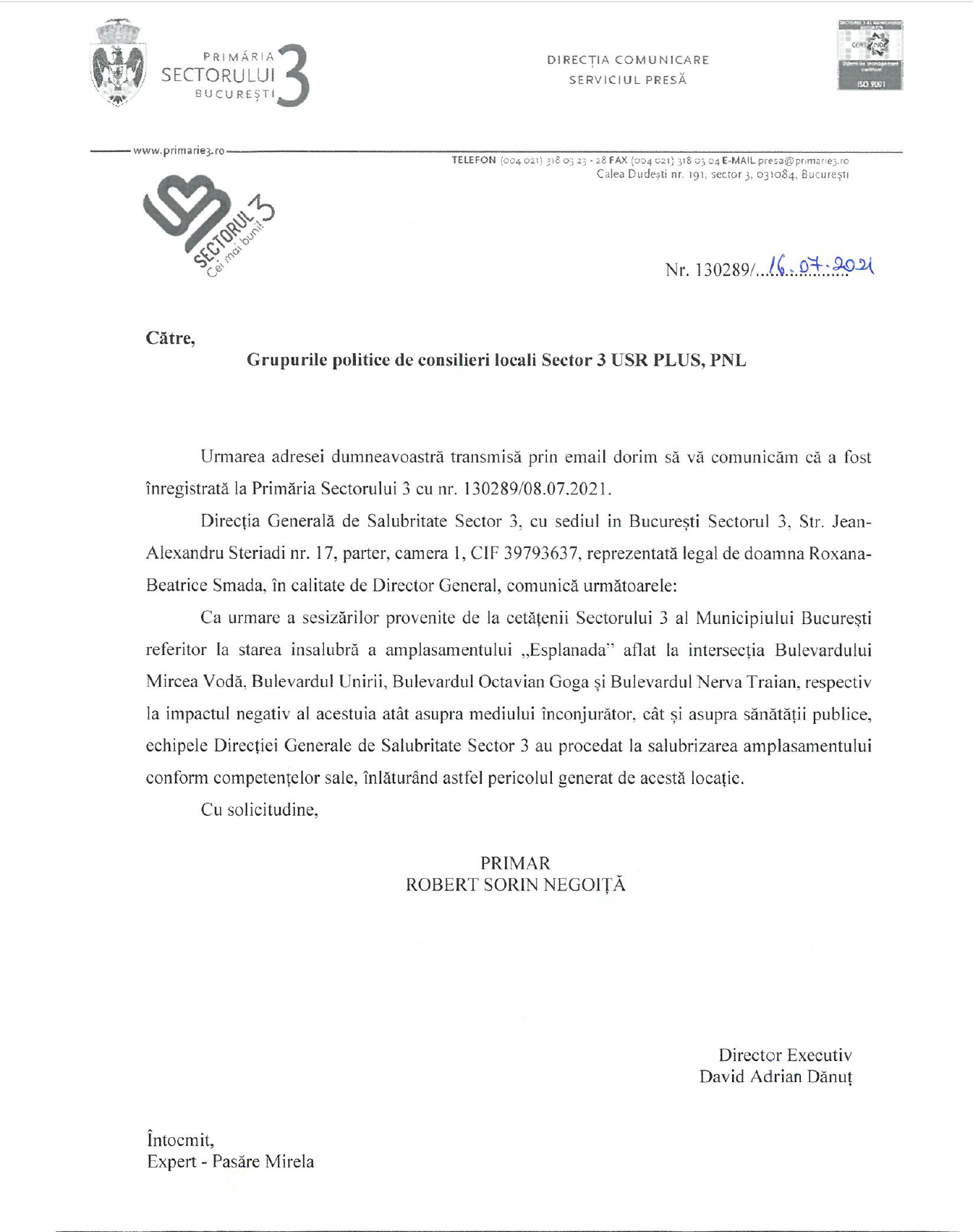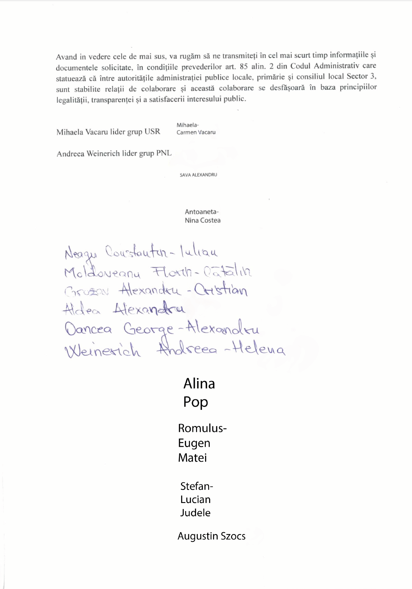 În adresa transmisă pe 7 iulie, consilierii USR-PLUS și PNL din Sectorul 3 i-au scris primarului Robert Negoiță, cerându-i să spună: