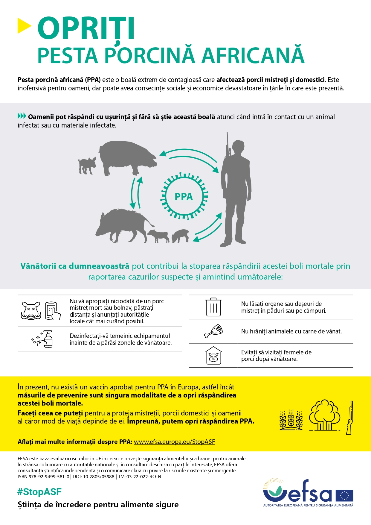 Pentru mai multe informații, vizitați site-ul web al campaniei ASF a EFSA, unde veți găsi fișe informative, infografice, kit-ul de postări pentru rețelele sociale și alte materiale.