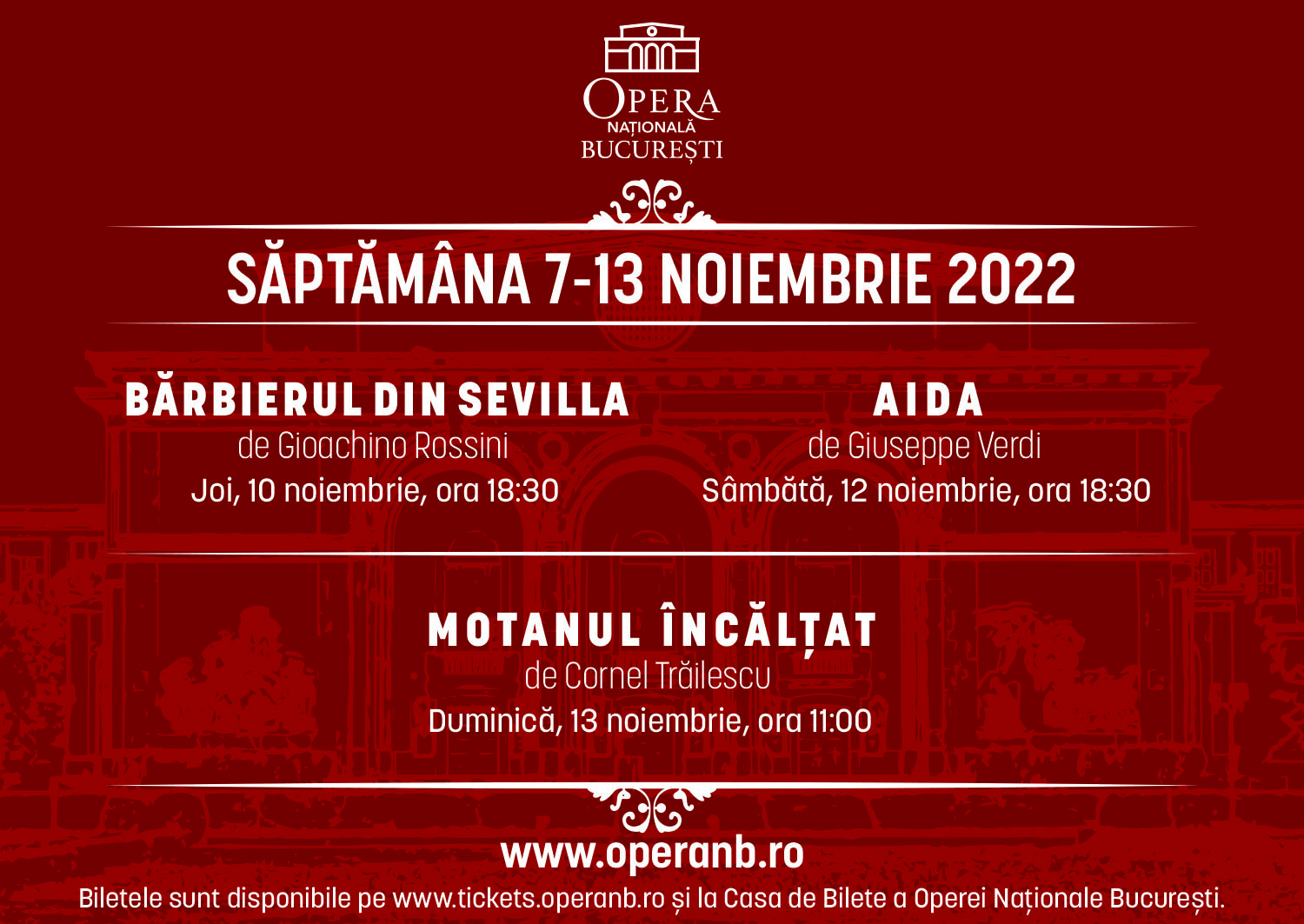• Cea de-a doua săptămână a lunii noiembrie aduce pe scena mare a Operei Naționale București două titluri de referință din repertoriul universal, opera „Bărbierul din Sevilla” de Gioachino Rossini și opera „Aida” de Giuseppe Verdi, precum și spectacolul pentru copii cu opera „Motanul încălțat” de Cornel Trăilescu.