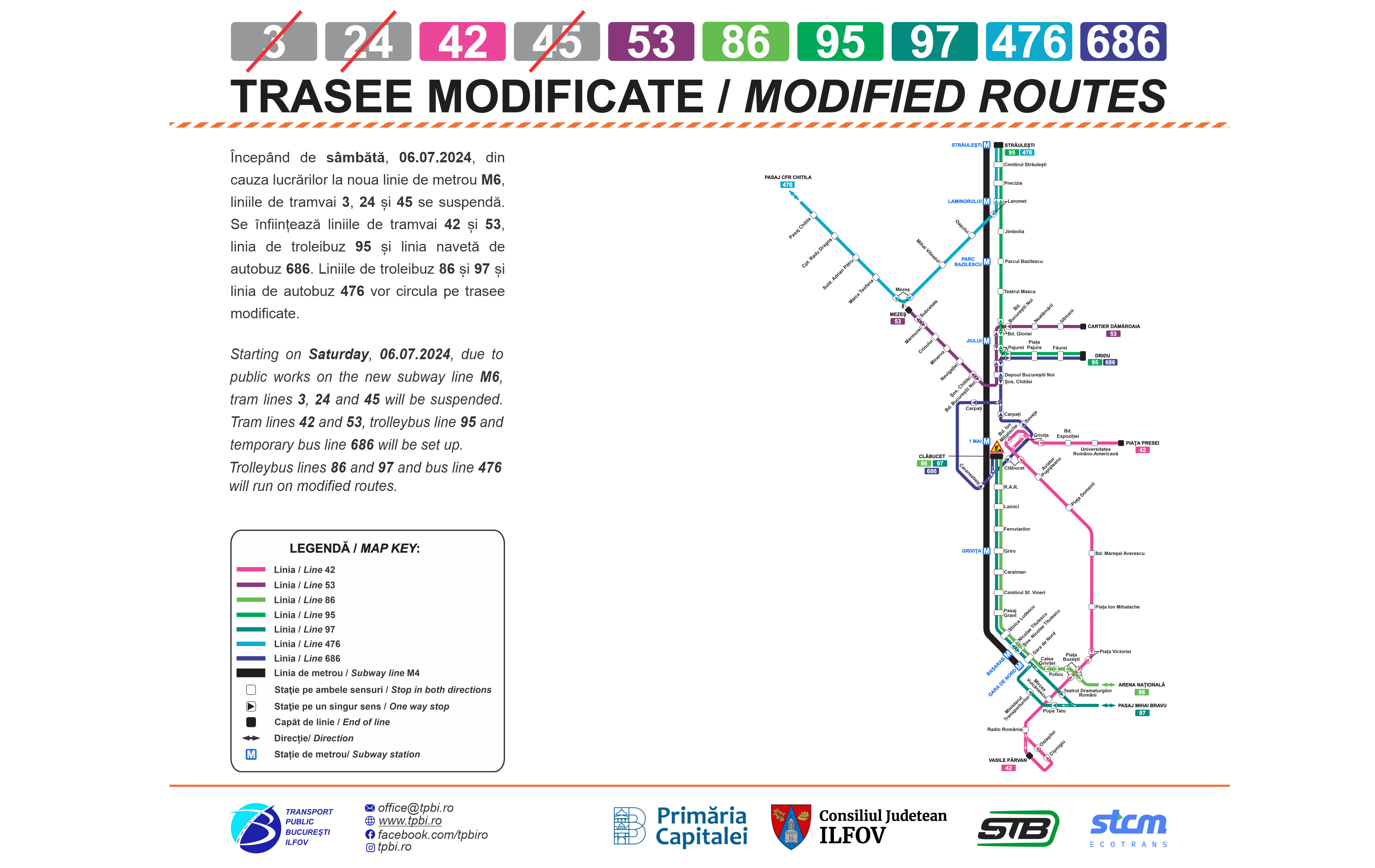 Precizăm că aceasta reprezintă o primă etapă a planului de măsuri pregătit de TPBI pentru asigurarea transportului public de suprafață în zonele în care vor avea loc lucrări de execuție a Magistralei 6 de metrou. Pe măsură ce procesul de execuție va impune alte modificări ale programului de transport, acestea vor fi anunțate în mod public.